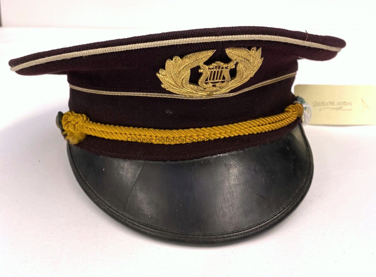 Burgundy colored Cathay Band hat with gold trim and band. Gold-colored emblem attached to front-center. Two buttons on left and right sides with a gold rope attached to them. Inside: leather band. Tag, inside crown, which reads "Thomas Tong 2/26/37 5456-42"Context