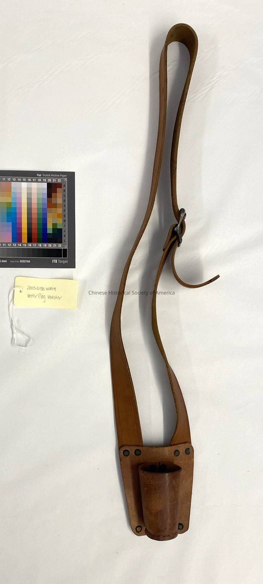 Brown leather holster, for holding a flag or a pole of different musical instruments. There is a long strap with a buckle for adjusting the length, and a small cylindrical holster. This holster was used by the Cathay Band.Context
