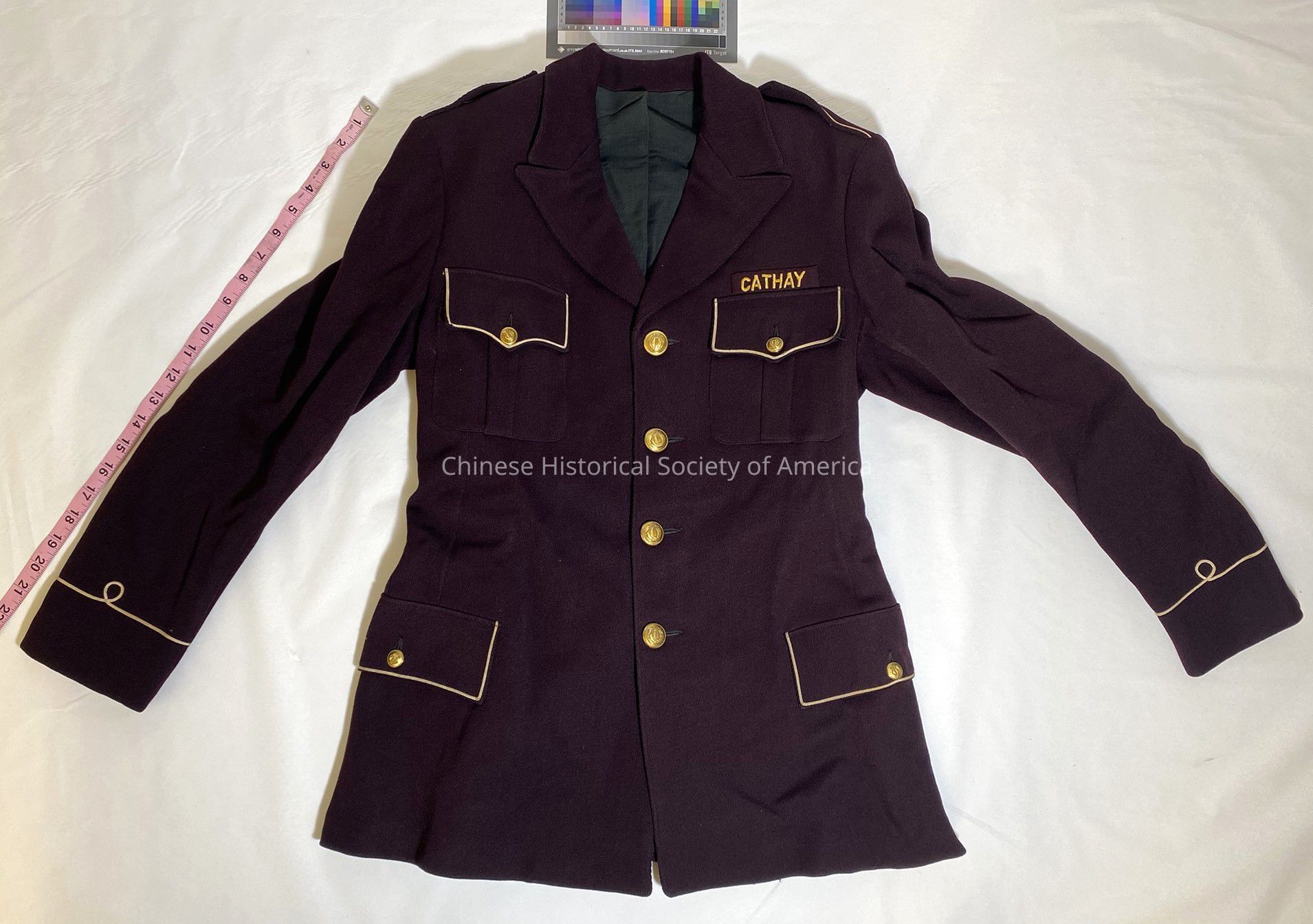 Burgundy colored jacket with cream colored trim around the pockets, cuffs, and epaulettes. The jacket has an epaulette on each shoulder with a gold-colored button on each, two breast pockets each with one gold button, two hip pockets each with one gold button, and the word "Cathay", in gold-colored embroidery, above the left breast pocket. All the buttons have a harp-shaped design on them. There are no labels or tags on this jacket. This jacket was part of the Cathay Band uniform.Context