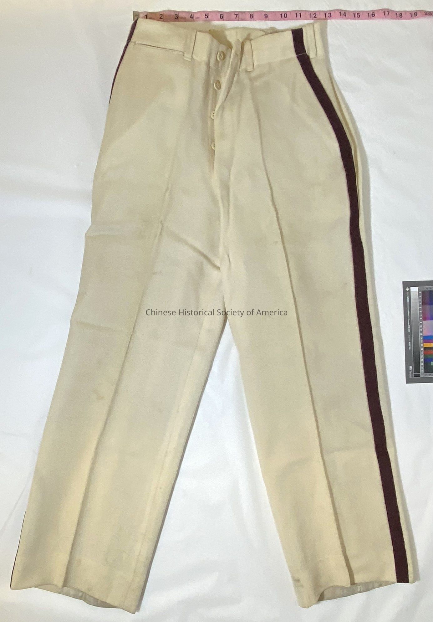 Cream colored pants with a burgundy colored stripe on the outside of each pant leg. The fly is fastened with four cream colored buttons, made of some sort of plastic (presumably Bakelite or celluloid). On the interior of each pant cuff is a band of fabric, that was used to keep the cuff resting on the top of the heel of the wearer's shoes. The pants have two hip pockets and one back pocket on the right side. Inside, sewn to the back pocket, is a label which reads, "San Francisco - Calif. Name: Sam Wong Date: 1/25/37 Number: 5456-35". These pants were part of the Cathay Band uniform.Context