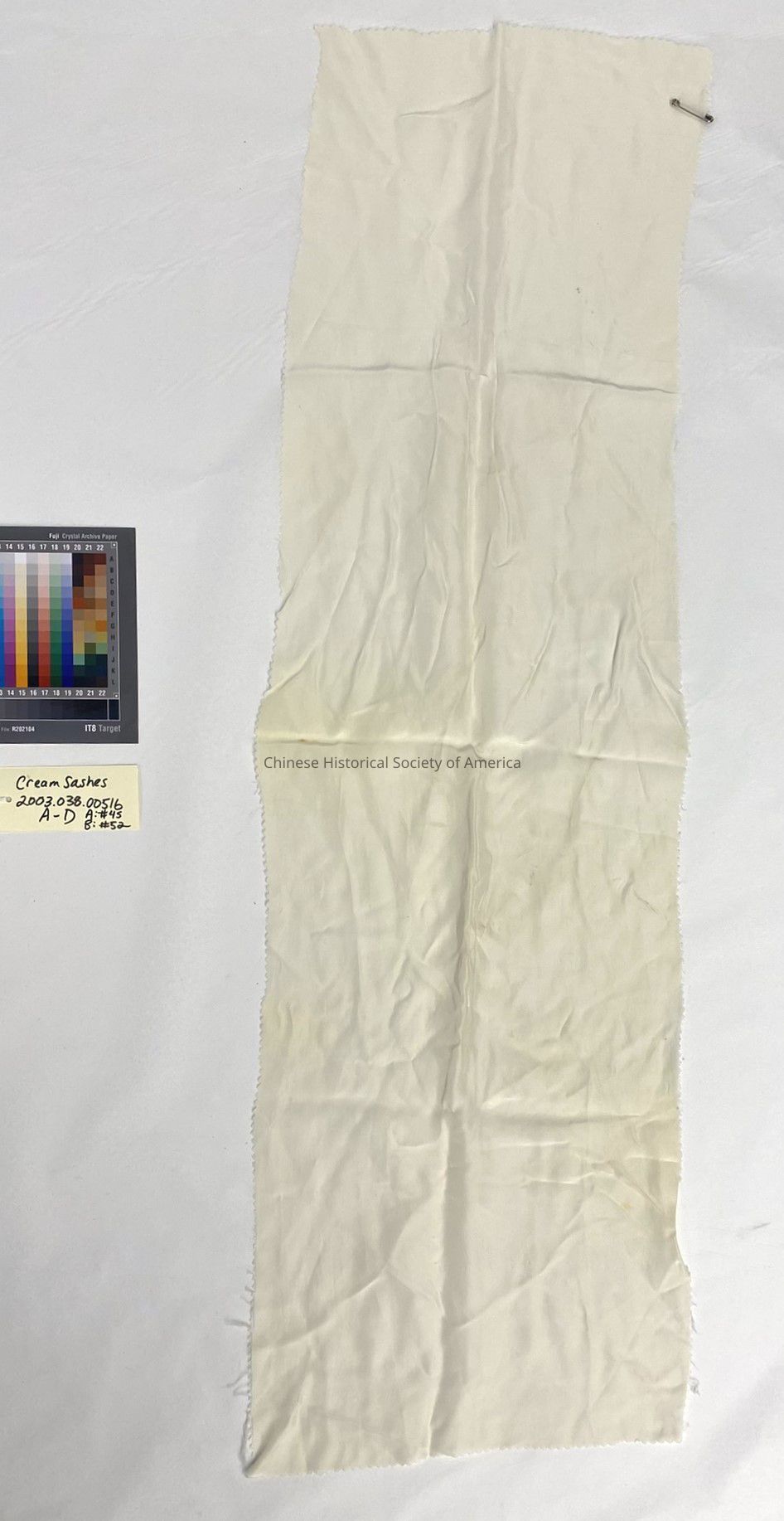 Cream colored sash with three jagged edges, and a safety pin on one corner. This sash was part of the Cathay Band uniform.Context