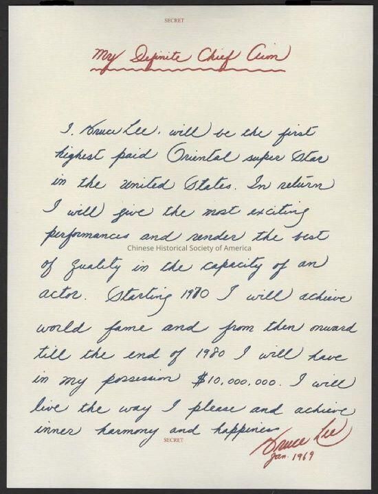 Transcription of Bruce's writing: "I Bruce lee, will be the first highest paid Oriental super star in the United States. In return I will give the most exciting performance and render the best of quality in the capacity of an actor. Starting 1970 I will achieve world fame and from then onward till the end of 1980 I will have in my possession $10,000,000. I will live the way I please and achieve inner harmony and happiness." Signed: Bruce Lee, Jan. 1969. Bruce Lee Foundation digital asset.