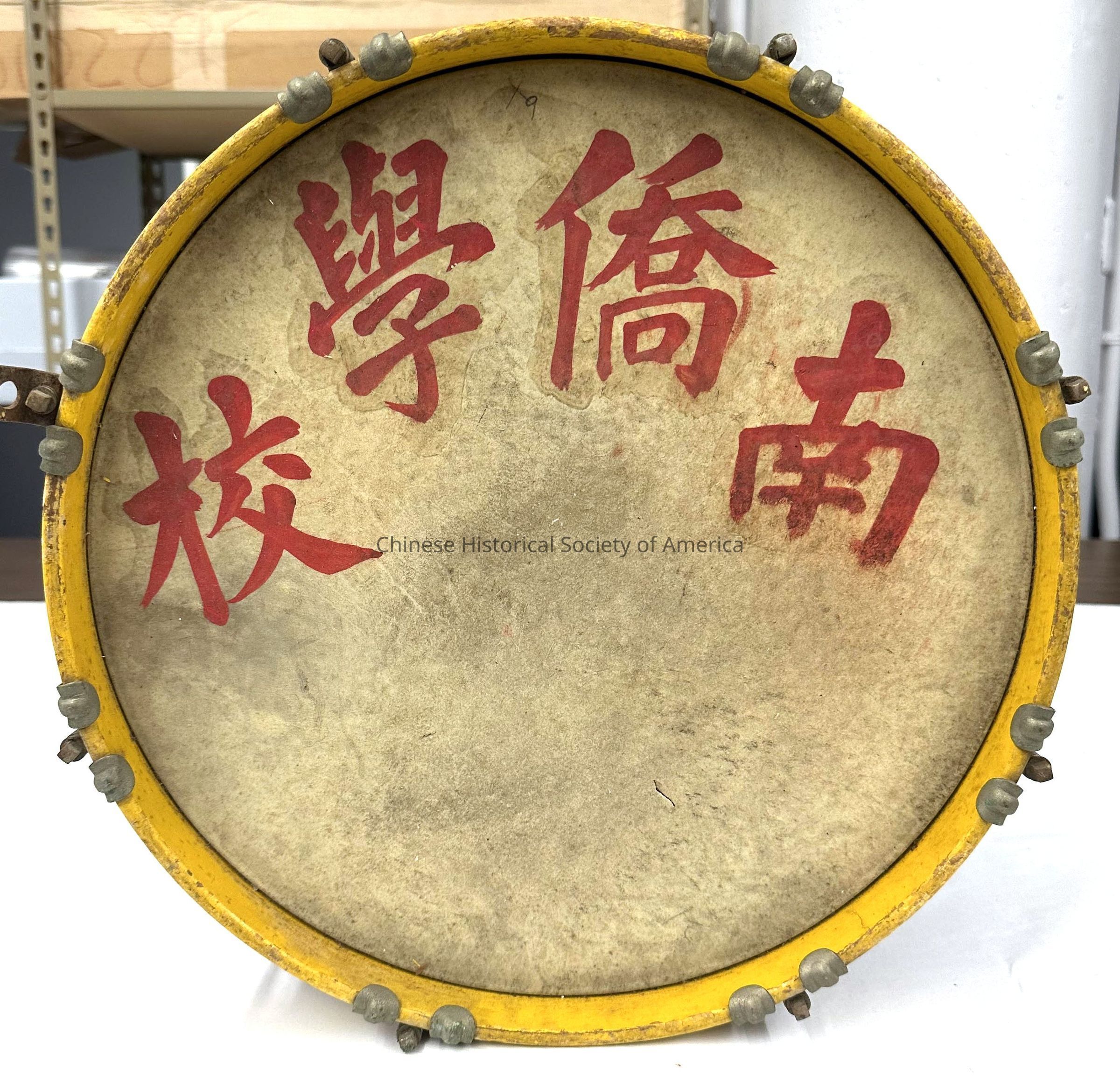 Nam Kue School Snare Drum. The drum has yellow rims and a black shell. In red, Nam Kue School's name is written in Chinese along the edge of the top head. "X" and "9" are written in pencil on top near border between Kue/Qiao and Xue characters. There is a maker's mark that reads, "Slingerland Quality Drums/Chicago ILL./U.S.A." This snare drum appears to be the Slingerland "Artist" Model, from the late 1920s.Context