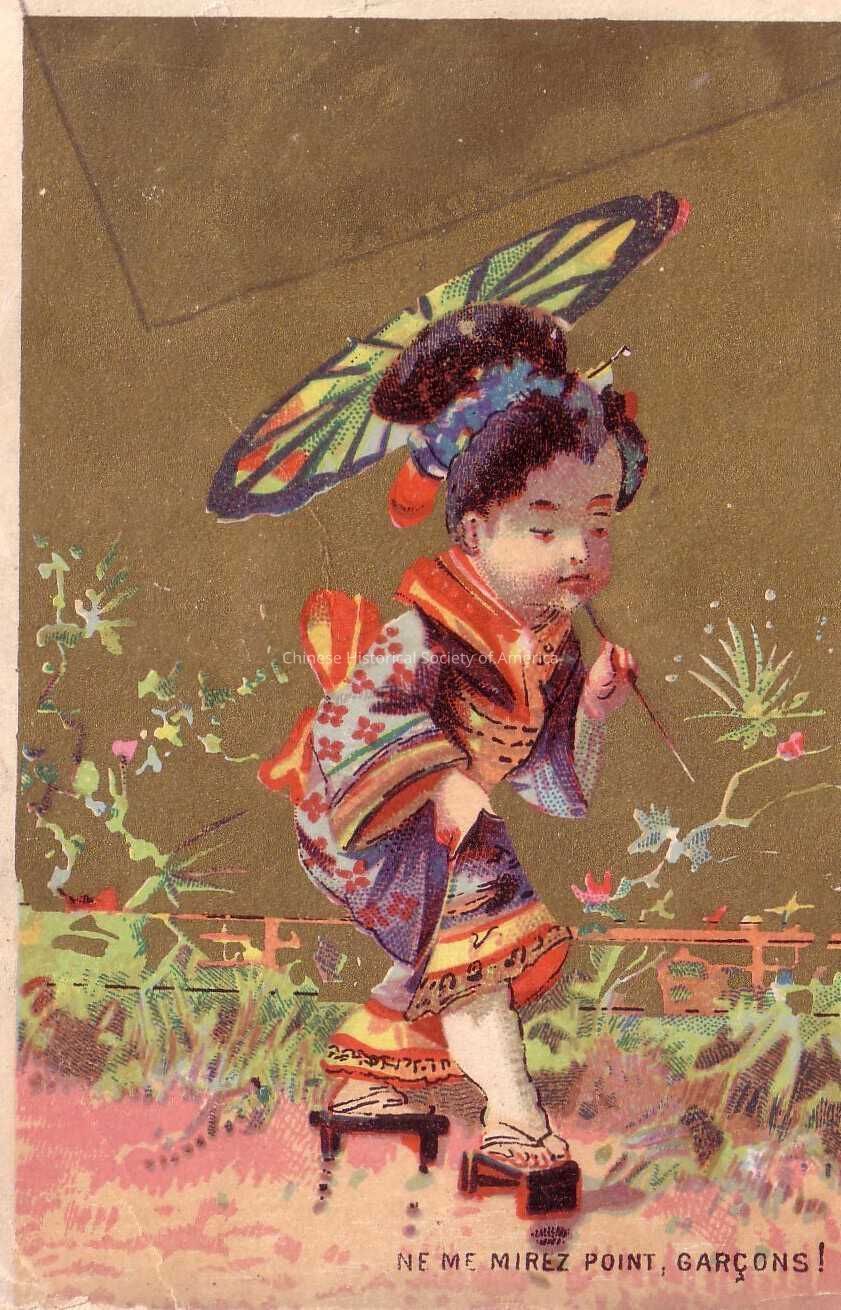 Front: An Asian woman wearing a blue, orange, and red traditional robe with a headdress and wood sandals, is walking across a field of grass, with one hand clutching on to her dress and the other holding on to a multi-color paper umbrella. Printed near the bottom right hand corner is the following: