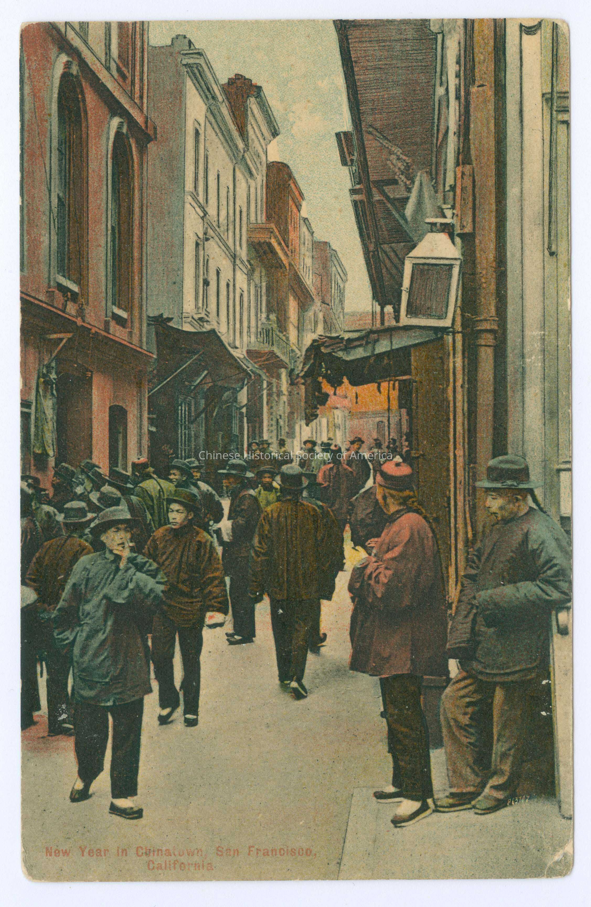 Duplicate: CHSA-04344. Front: Caption: "New Year in Chinatown, San Francisco, California." Back: Postmark: "San Francisco, Cal. Jan 30 1909 3:30 PM", stamped in black. Stamp: A green one cent stamp with tha picture of Benjamin Franklin, "Series 1