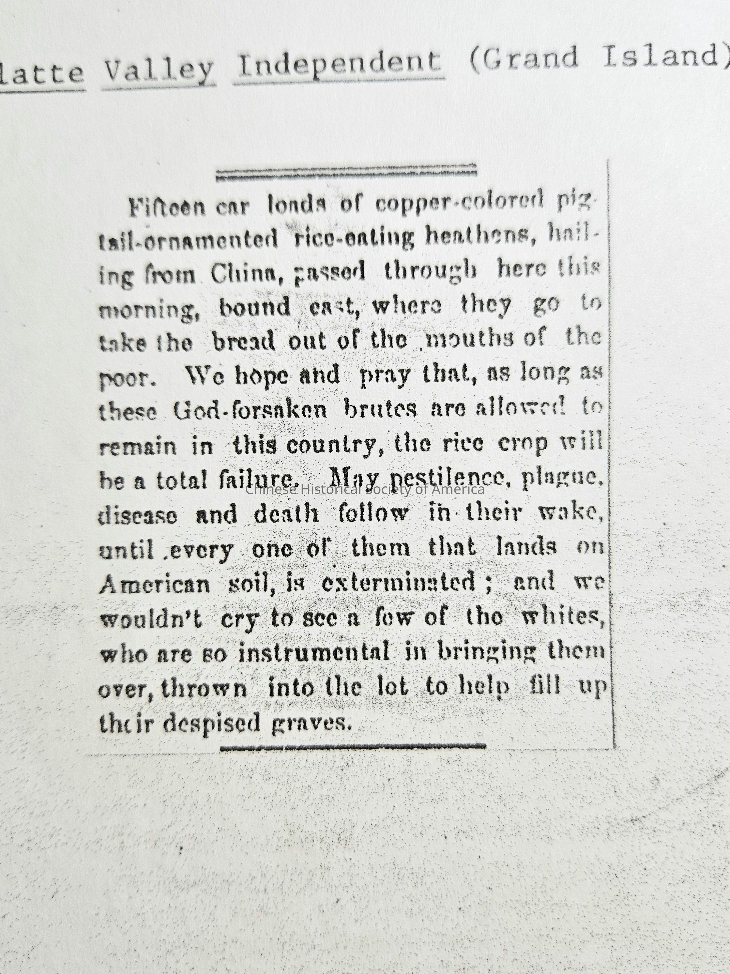 Racist article from July 9, 1870, Grand Island, Nebraska (photo copy)