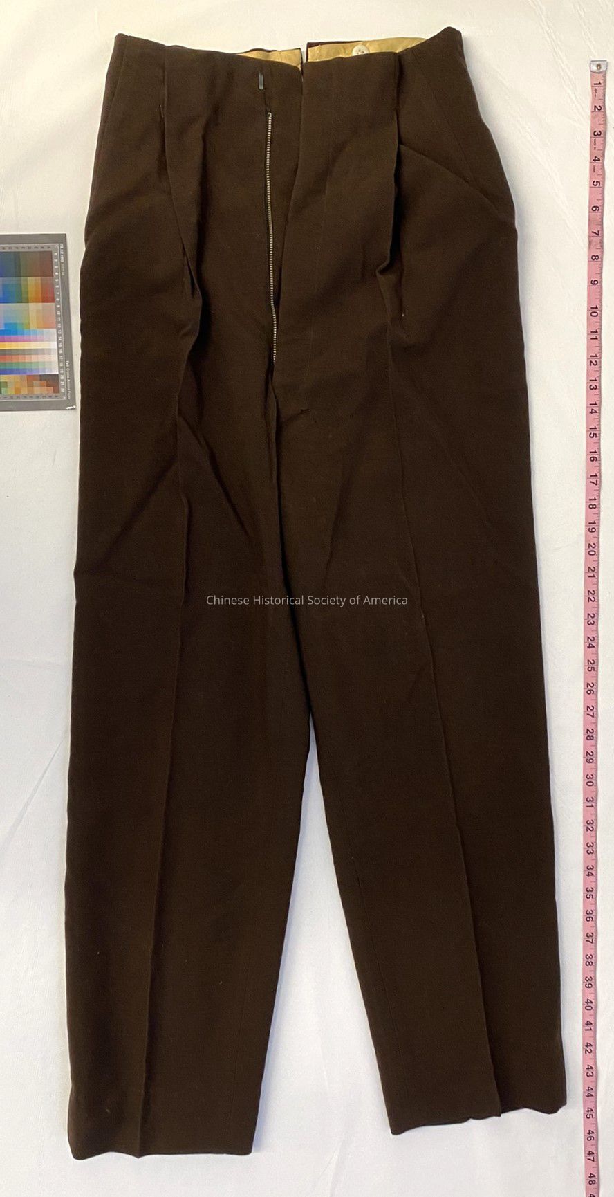 Brown pleated suit pants. The pants are part of a set. The pants have a Talon brand zipper on the fly. There are seven white buttons on the interior of the waistband. There is a hook clasp at the top, of the inside of the waistband. Based upon the interior stitching, the pants appear to be hand-tailored.