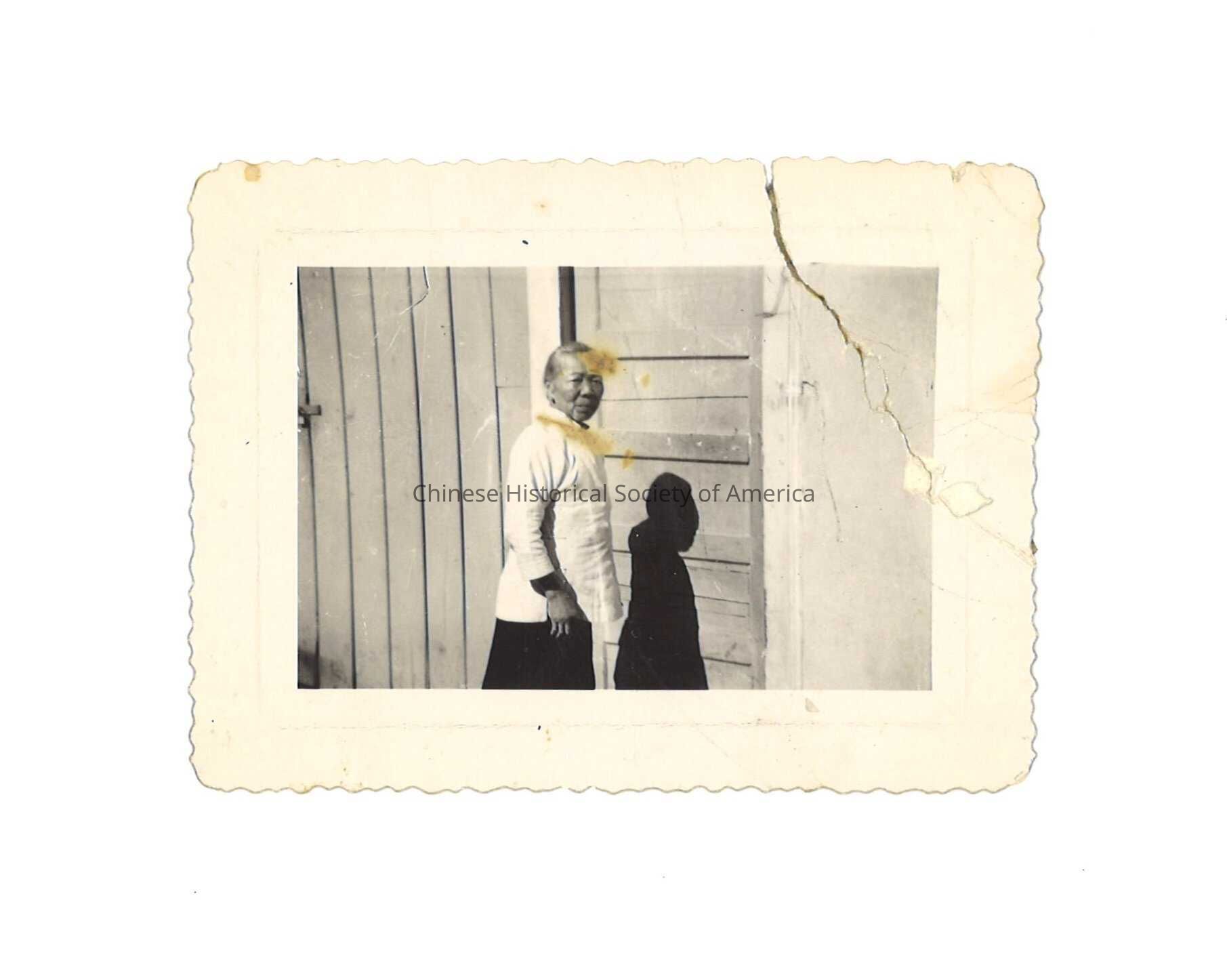 Black and white photo of an old woman in a white shirt and long black dress stands in front of a paneled house.