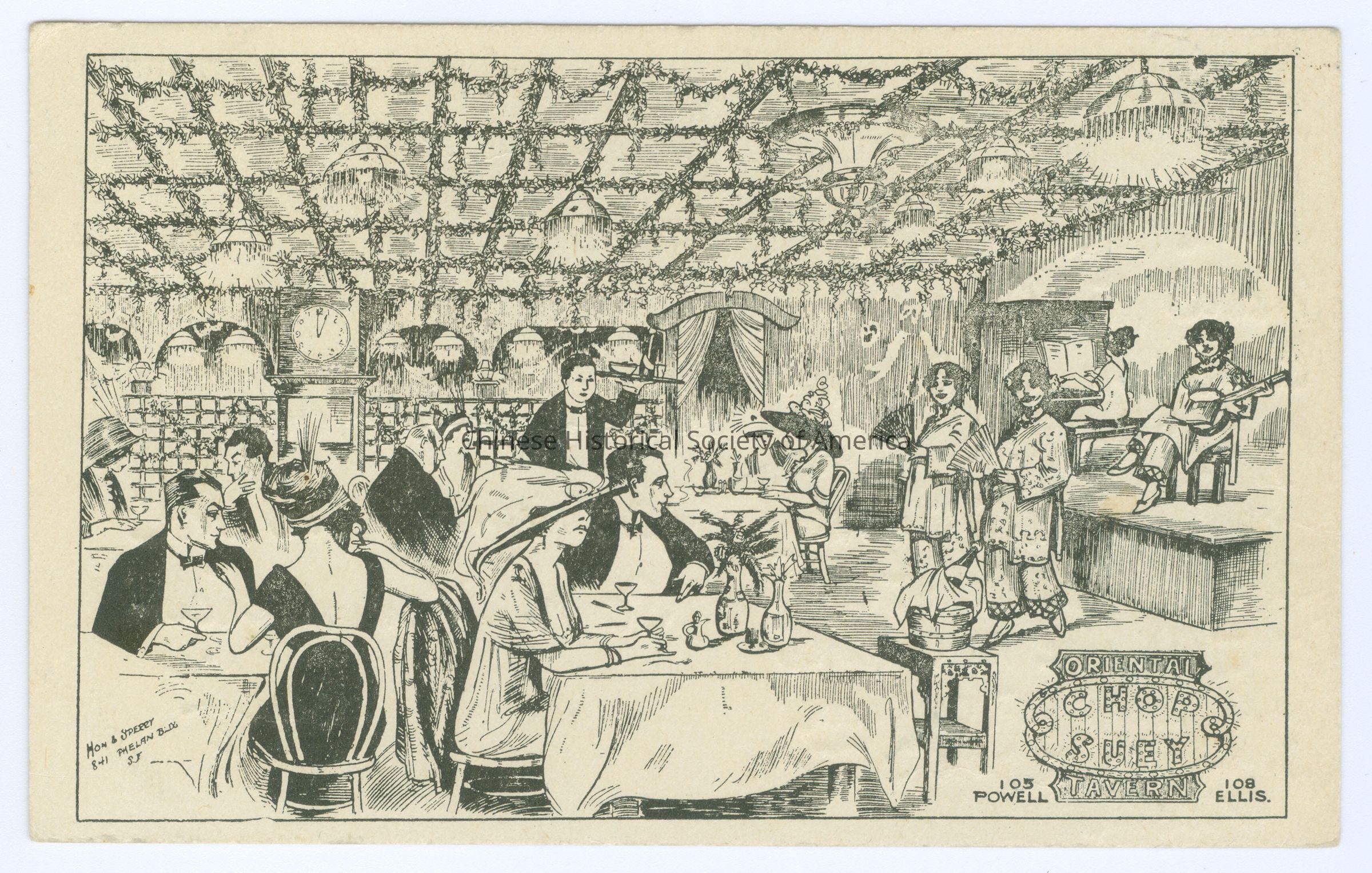 B&W. Illus. SF; Restaurants; Oriental Chop Suey Tavern: Inside shot of a restaurant where there are men and women sitting at a table watching a show where there are Chinese girls with fans and instruments, Chinese waiters are walking around.