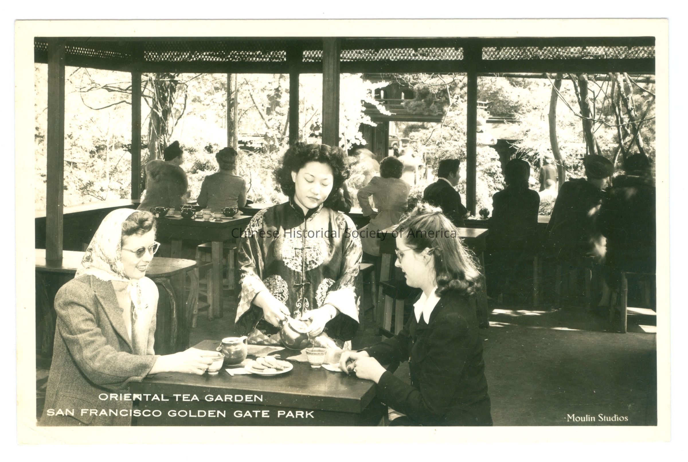 See CHSA-04432-04434. Front: Caption: "Oriental Tea Garden San Francisco Golden Gate Park." "Moulin Studios." Back: Old Accession #: N/A