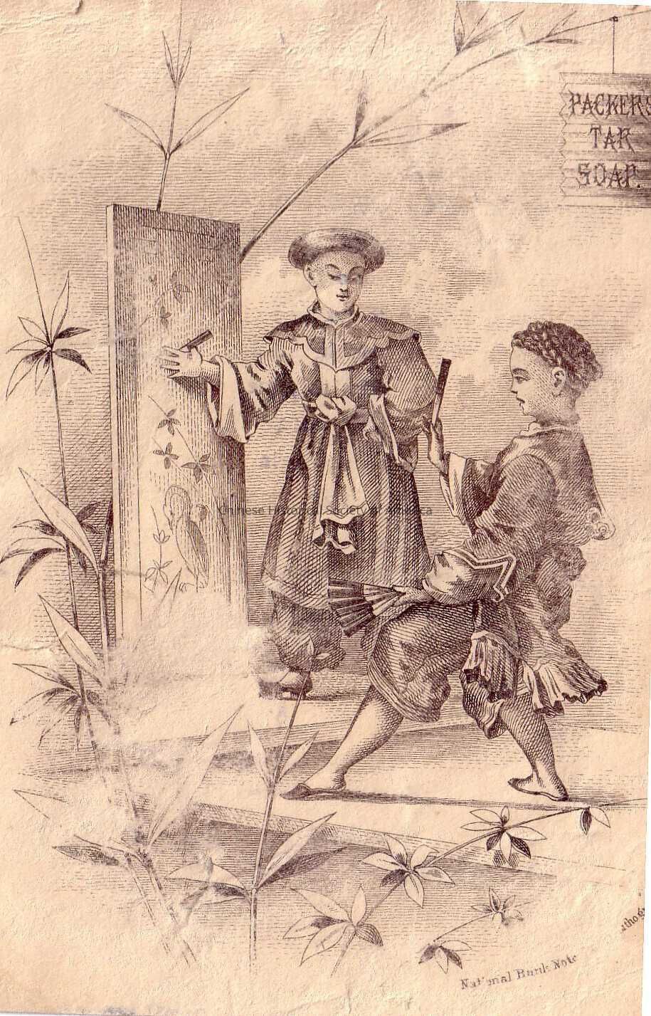 Front: A boy wearing a baggy shirt over his short pants and slippers is holding onto a fan as he throw knives at a painting. An older man who is observing the boy's progress is standing near the painting with his hand resting against it as a target. Around them are tall bamboo plants and resting on one of the branches is a string with a Chinese lantern attached to it, with the words "Packer's Tar Soap" on it.