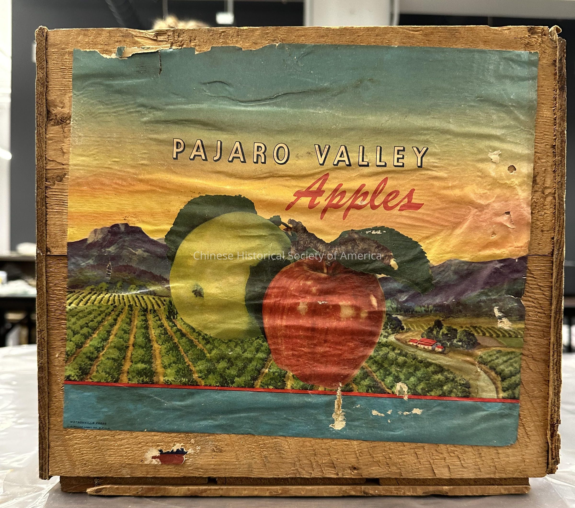 Wood crate with a label which reads, "Pajaro Valley Apples", and an illustration of apples in the foreground and a valley with orchards, mountains and a sunset in the background.Context