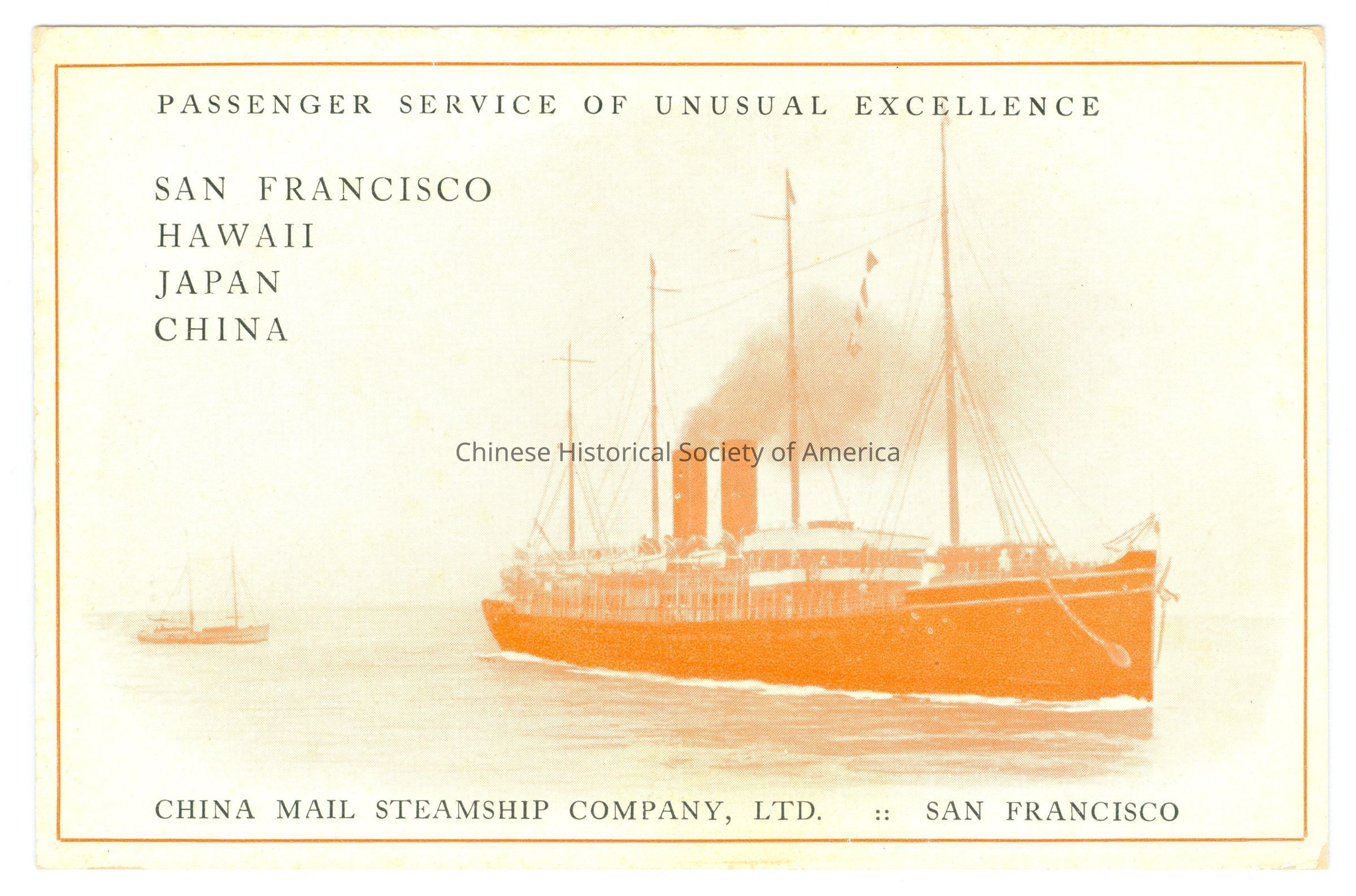 Front: Caption: "Passenger Service Of Unusual Excellence, San Francisco, Hawaii, Japan, China." "China Mail Steamship Company, LTD. San Francisco." Back: Old Accession #: GET