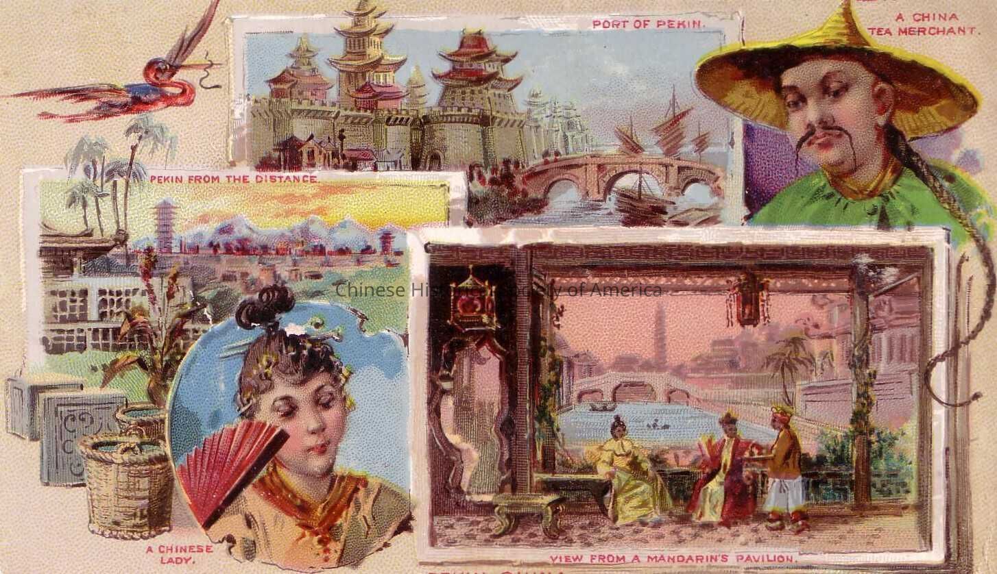 Front: On the front of this tradecard six different scenes of Pekin-China is illustrated. On the Top right hand corner there is a picture of "A China Tea Merchant" who is wearing a green jacket, a straw sampan style hat, and sporting a long queue. On the lower right hand corner there is the "View From a Mandarin's Pavilion" in which a woman in yellow and a man in red are sitting down waiting to be served tea by their servant. In "A Chinese Lady" we see a woman illustrated wearing a distinct headdress and embroidered dress and clutching a red fan. In "Pekin from the Distance" there is a elaborate village scene of Pekin and the rolling hills that exists behind it. Lastly in "Port of Pekin" there is a picture of the city's impressive architecture.