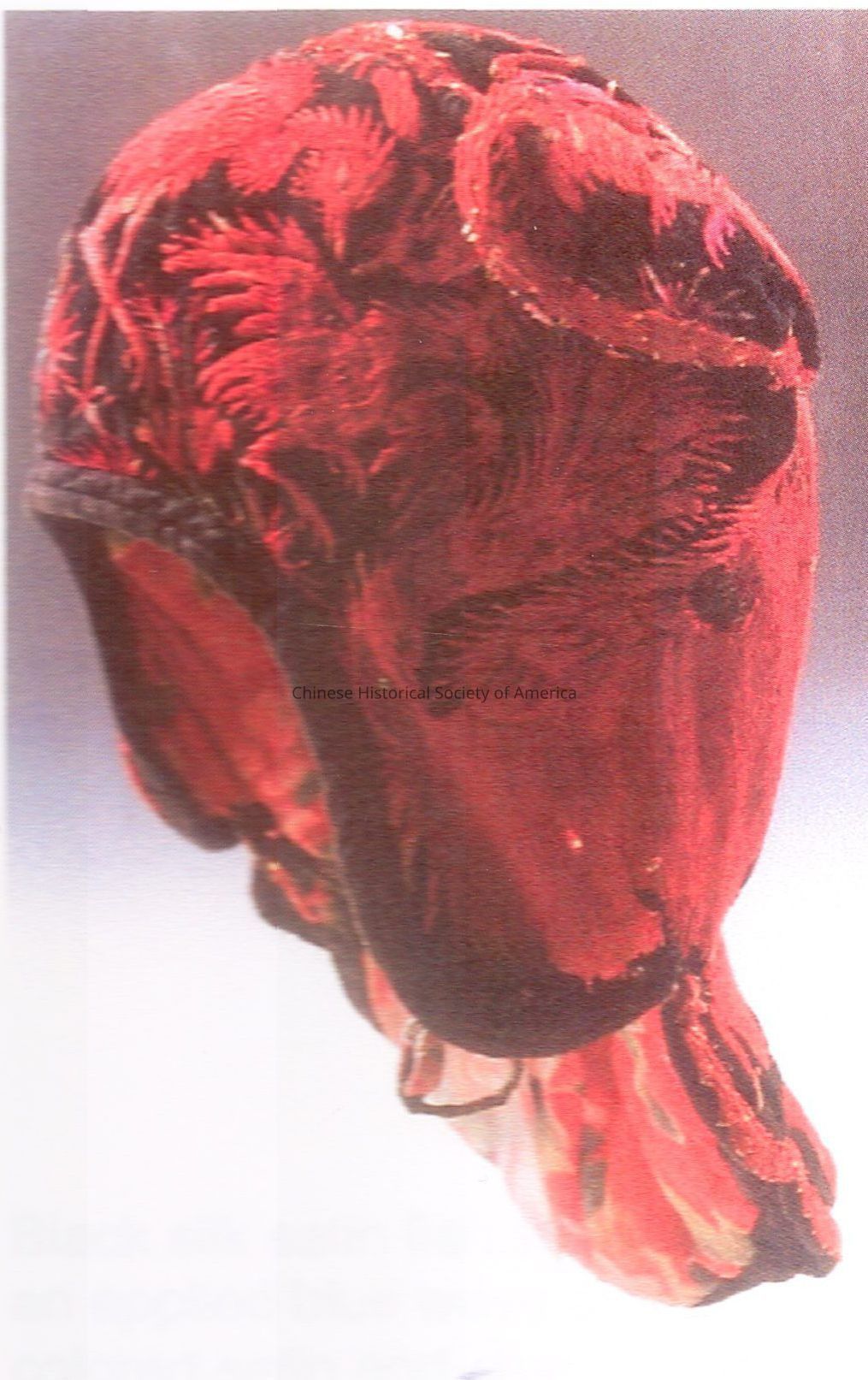 Padded black velvet wind hat with red and gold Phoenix birds wrapping from the front down the shaped back flap.Context