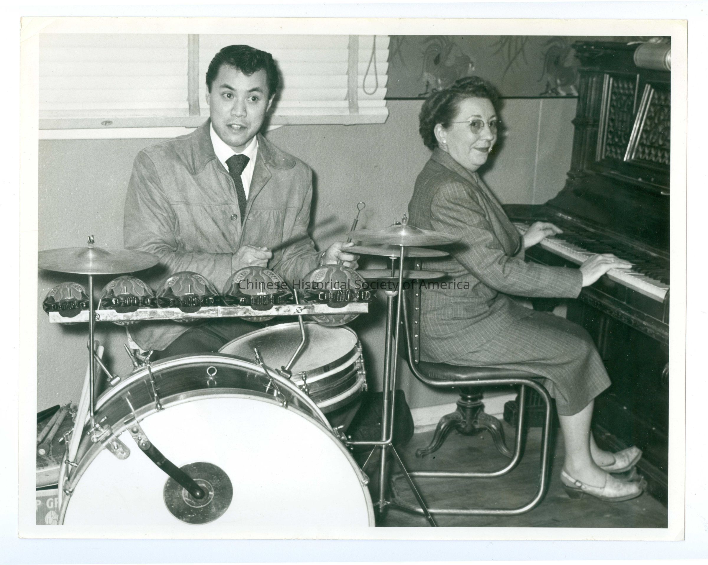 Photograph of Lloyd Chan playing drums with pianist, Evelyn Brown.