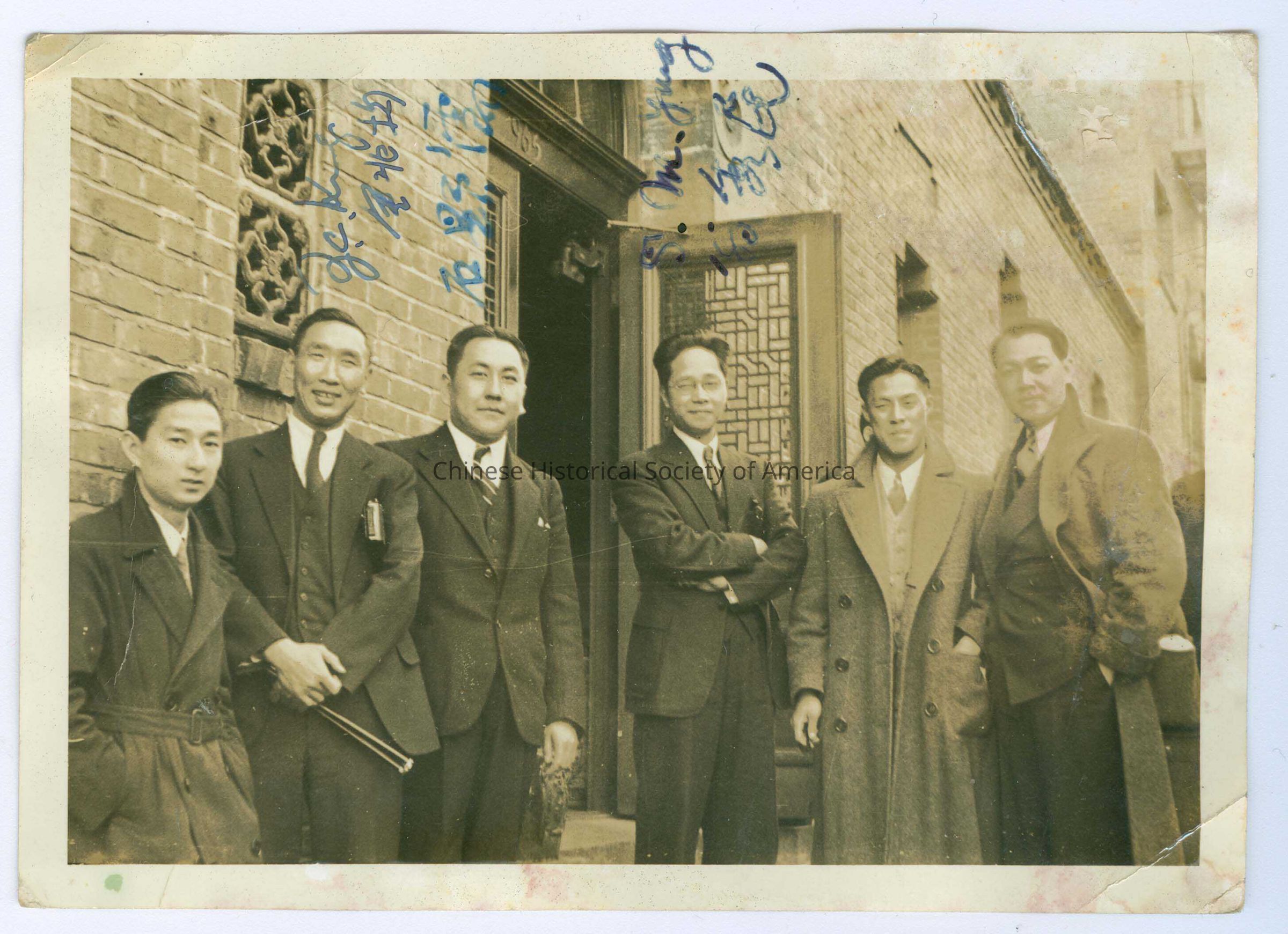 Photograph of 6 men standing in front of the former YWCA building (current Chinese Historical Society of America Museum)