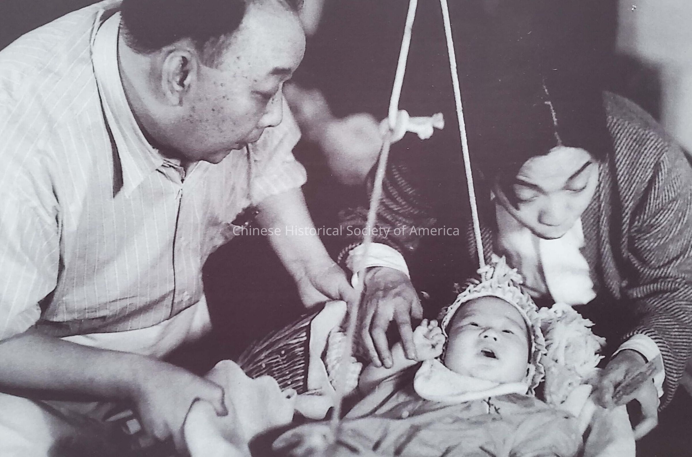 Mounted B&W photograph, baby Bruce Lee in swinging bassinet with two adults (parents)