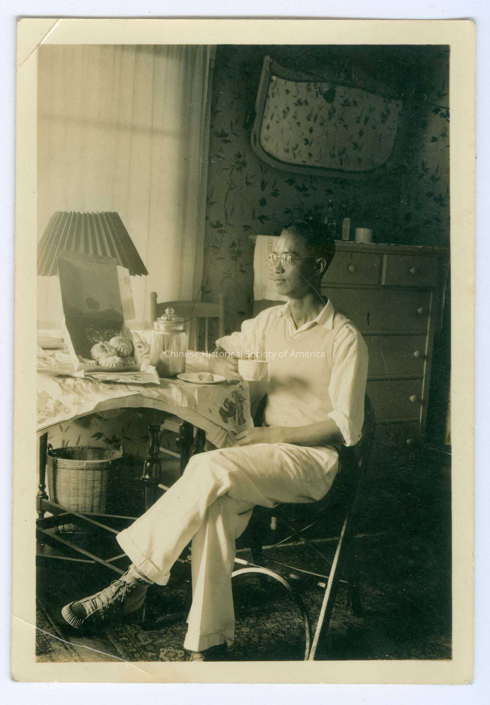 A photograph of a man sitting in a room drinking.