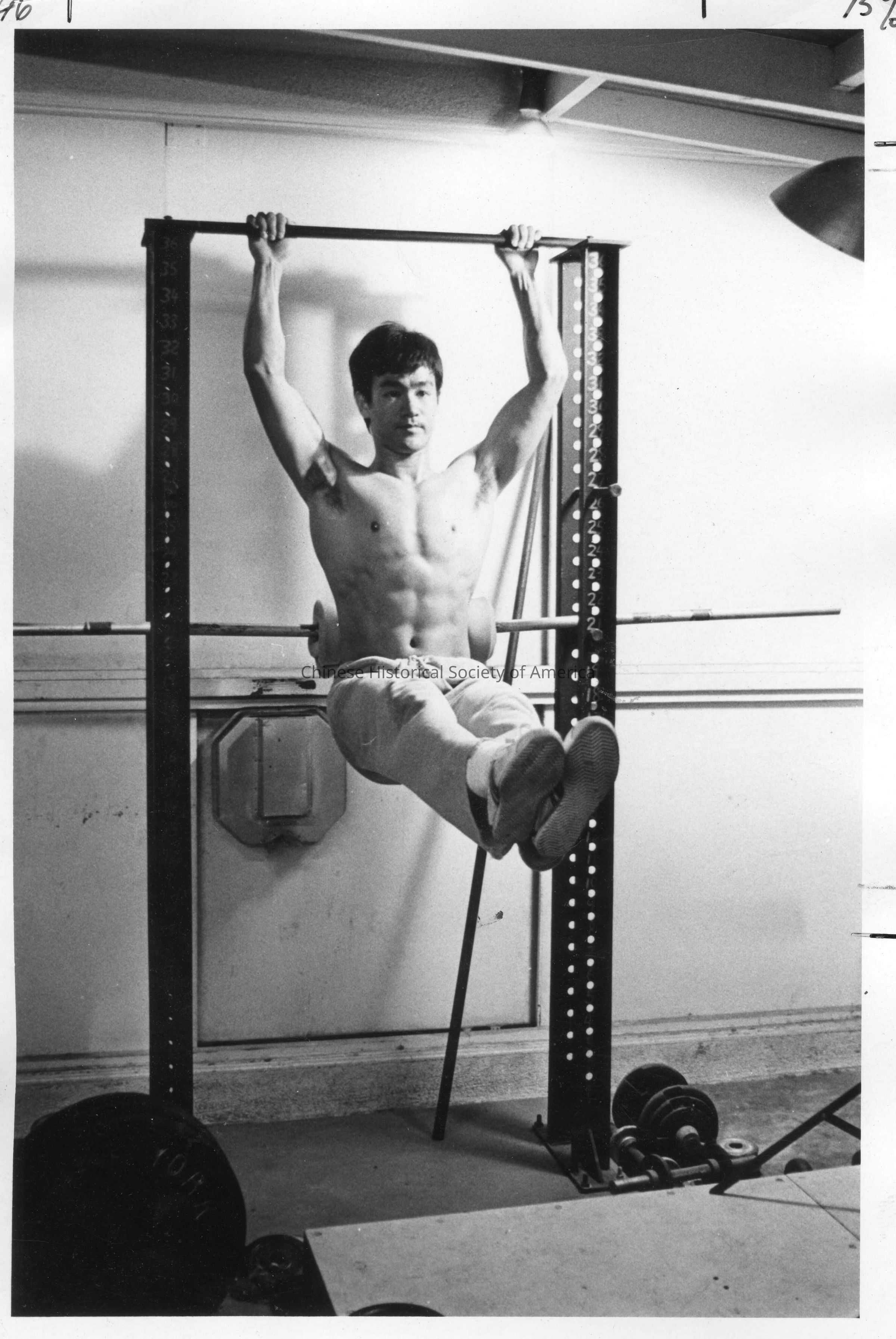 Bruce Lee in leg lift position using a chin up bar.