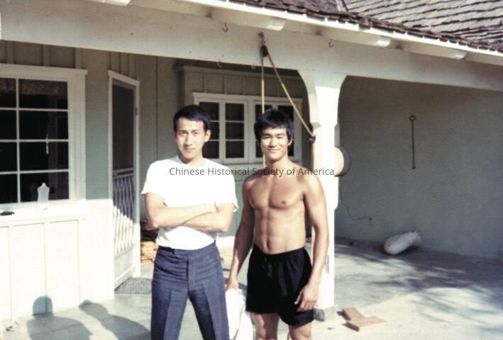 Retrieved from Bruce Lee Foundation: Bruce shirtless, shorts, smiling, portrait, friends, unknown, house, backyard, yard, patio, home, practice.
