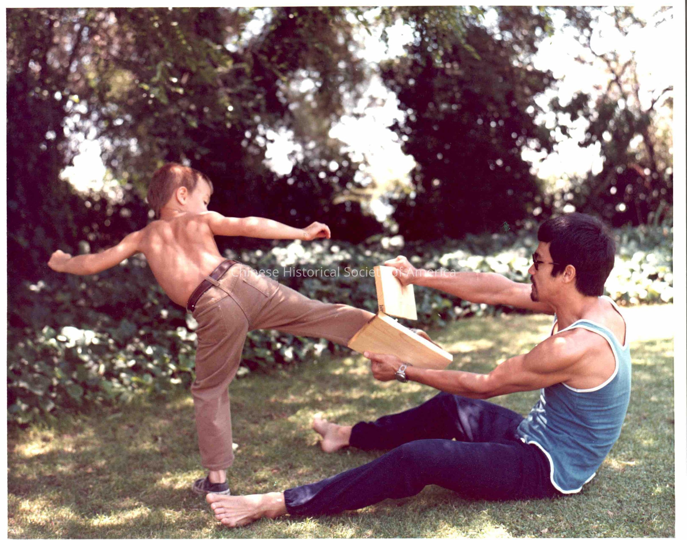 Retrieved from Bruce Lee Foundation: Bruce and Brandon in backyard grass, tree, home, demo kicking with wooden block. Brandon is shirtless with brown pants, Bruce is wearing blue tank top and blue pants, beard, sunglasses.