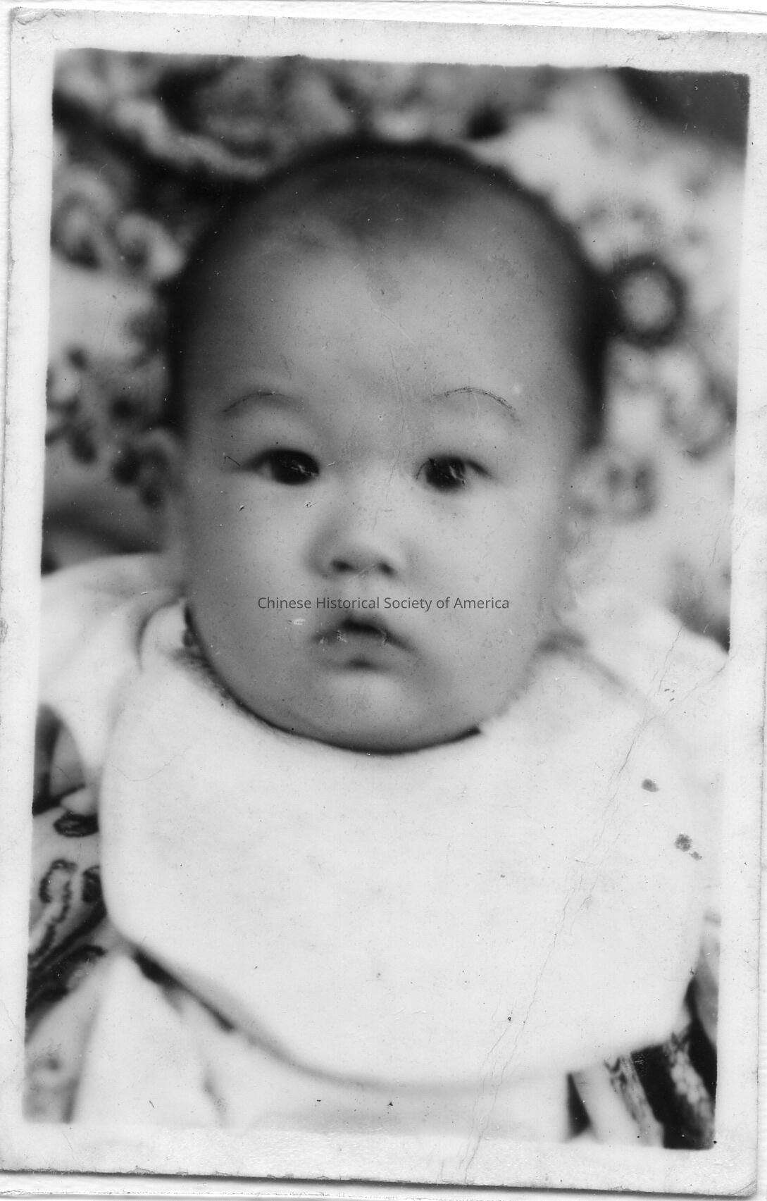 Retrieved from Bruce Lee Foundation: Bruce as infant, baby, bib, tightly cropped portrait, soft focus