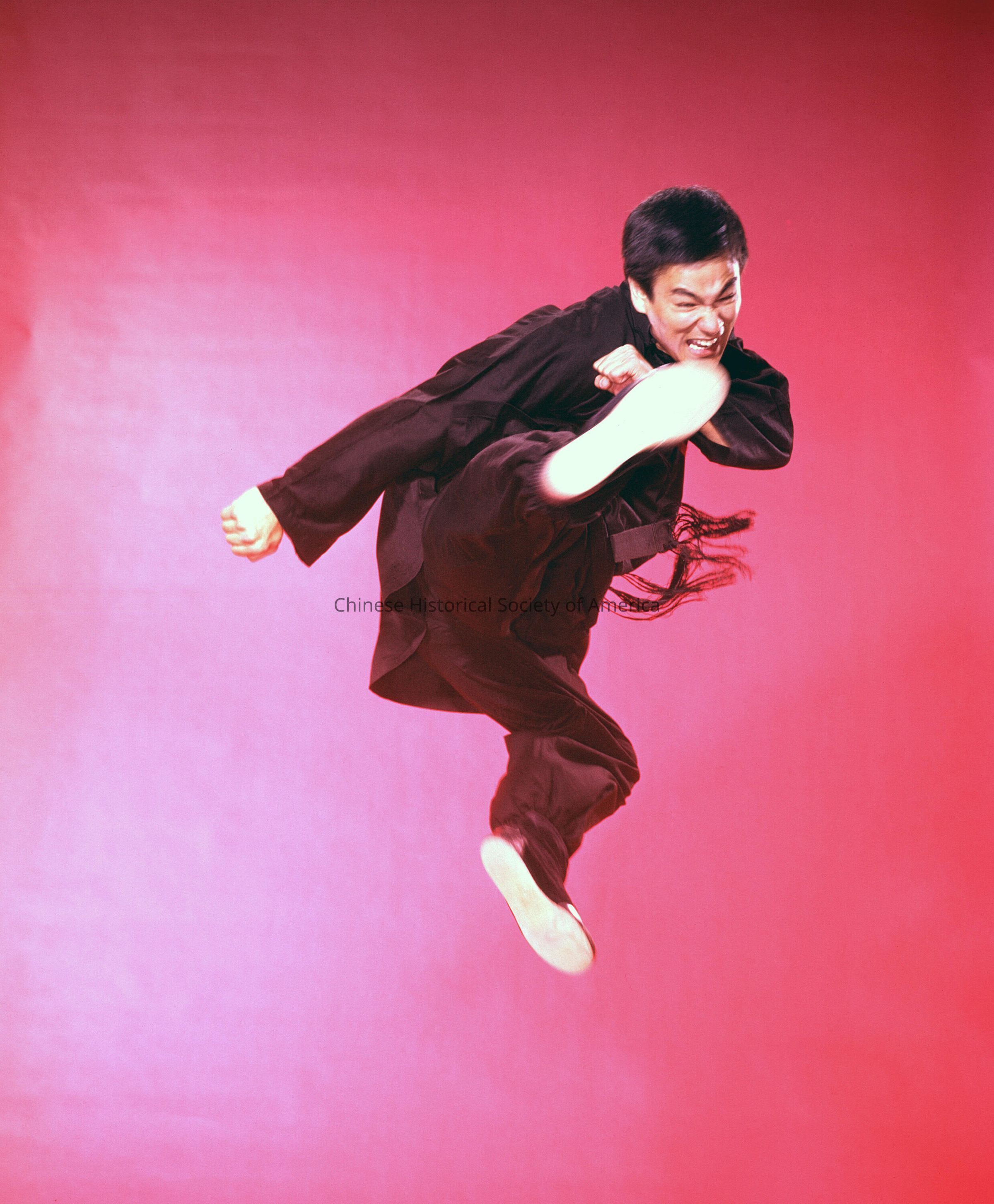 Retrieved from Bruce Lee Foundation: Bruce in black gi in flying man kick, jumping, kicking, promo shot, pink background, mouth open, promo shoot for Green Hornet.