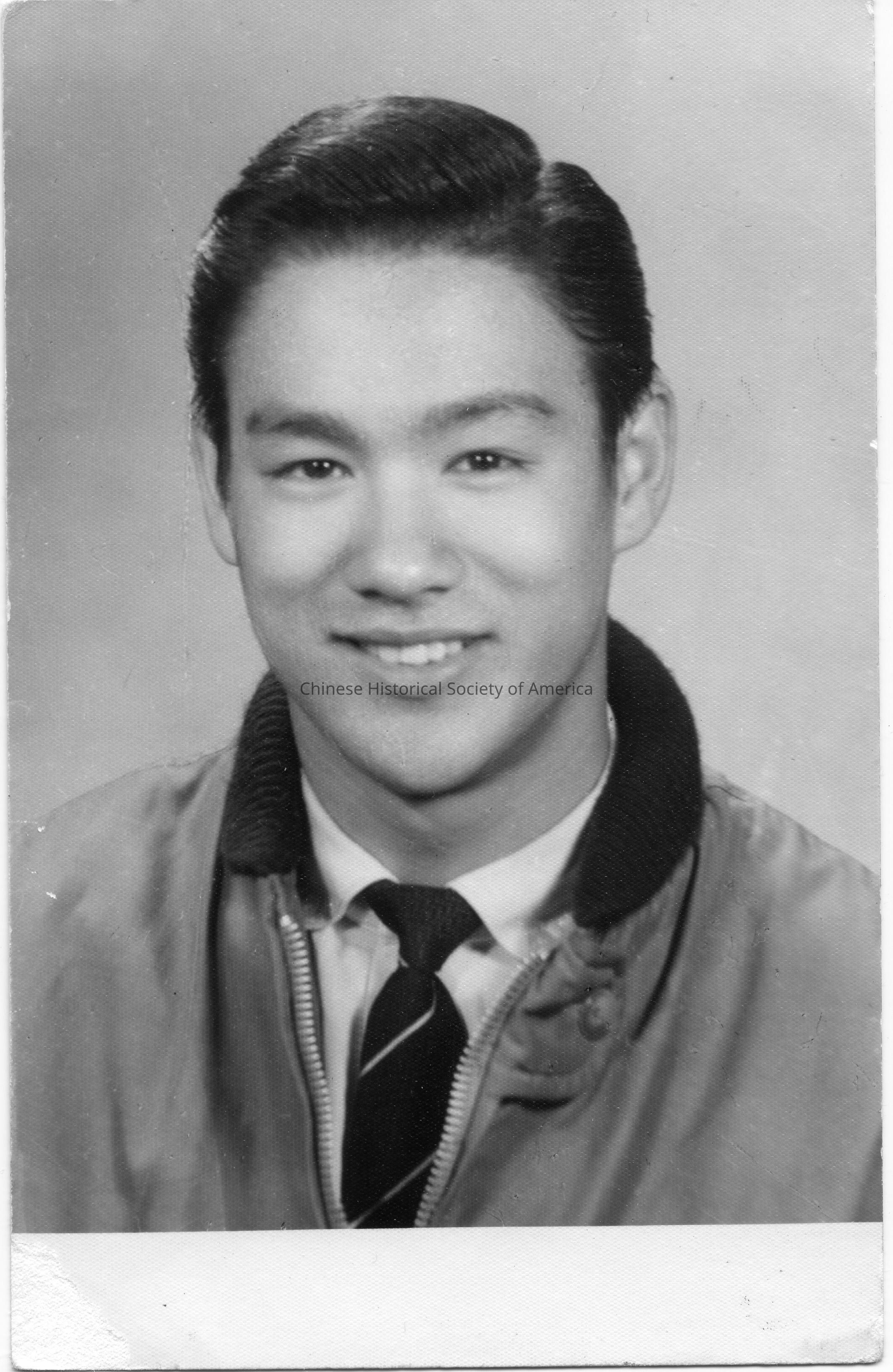Retrieved from Bruce Lee Foundation: Bruce in jacket, car coat, with tie, smiling, portrait, studio, formal, tightly cropped, early years, young, youth fashion.