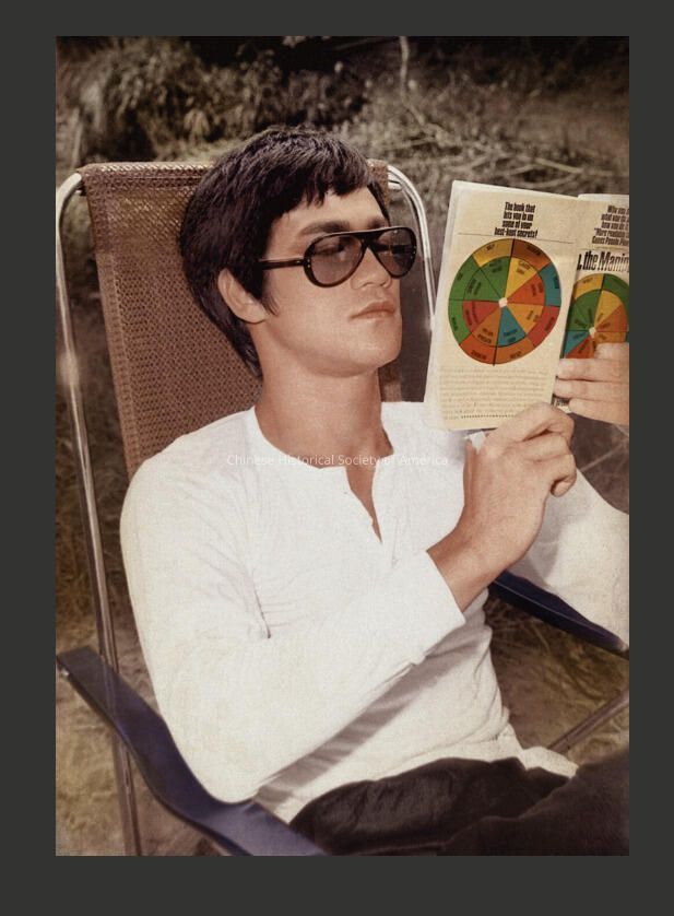 Retrieved from Bruce Lee Foundation: Bruce in white shirt, sunglasses, sitting, reading book on set of BB, portrait, colorized, rare.