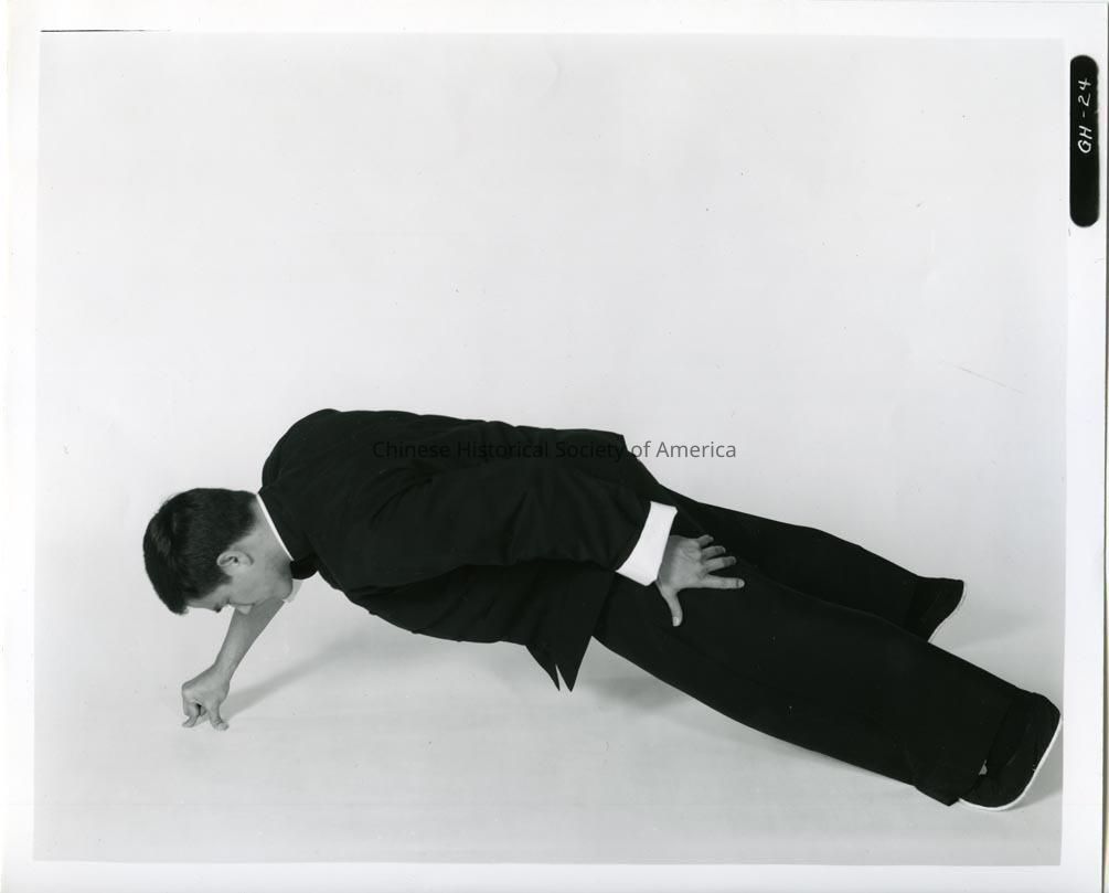 Retrieved from Bruce Lee Foundation: Bruce in black gi one arm, two finger push up, promo, press shot, practice, portrait, for GH.