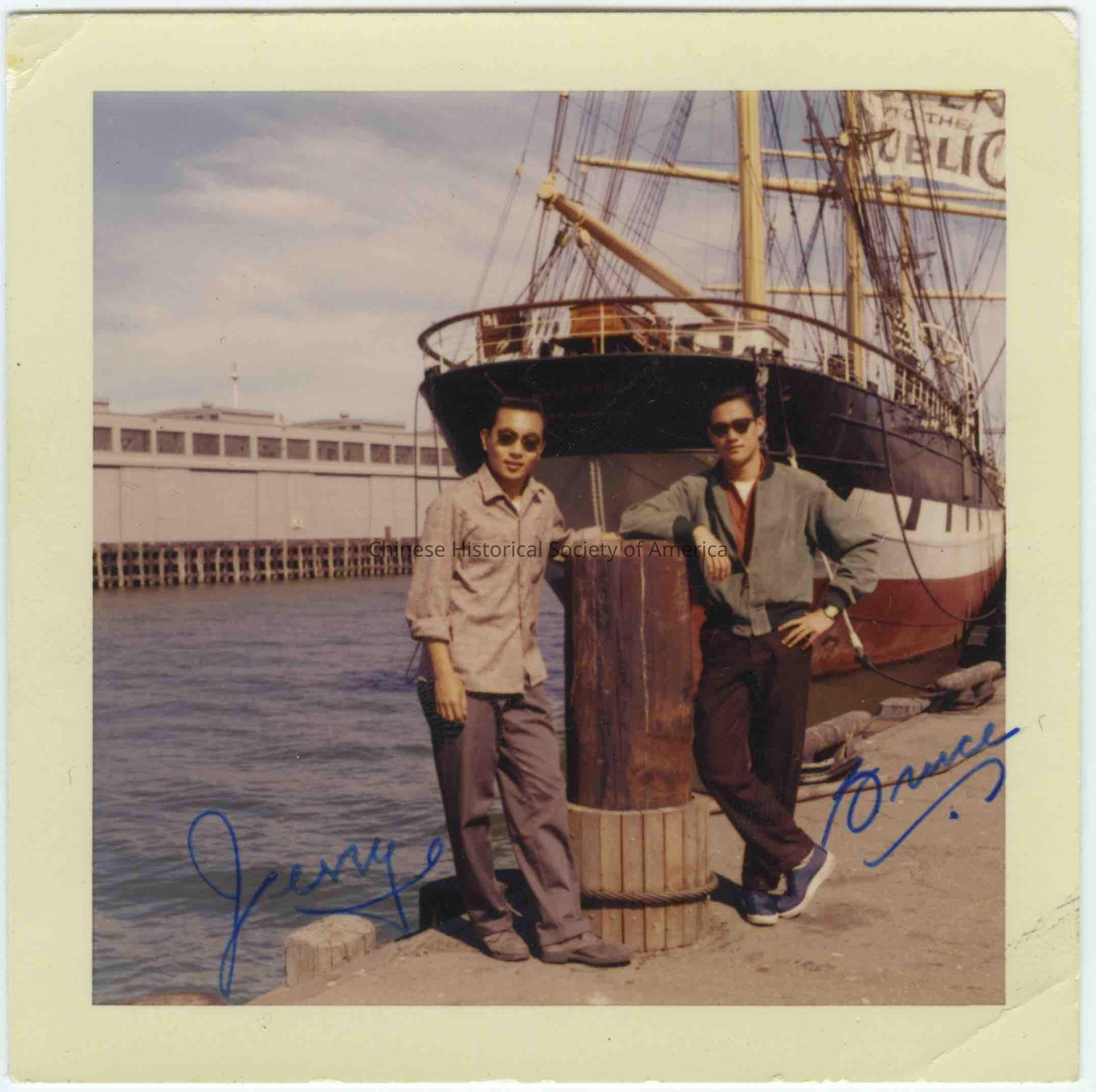 Retrieved from Bruce Lee Foundation: Bruce during brief period of arrival in July 1959 in San Francisco Bay Area/Oakland before relocating to Seattle. Jacket, sunglasses, ship, boat, pier, ocean, bay, signed, with friend, Jerry, 'Jerry'.