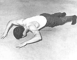 Retrieved from Bruce Lee Foundation: Bruce in thumb push ups, tank top, photographed from above.