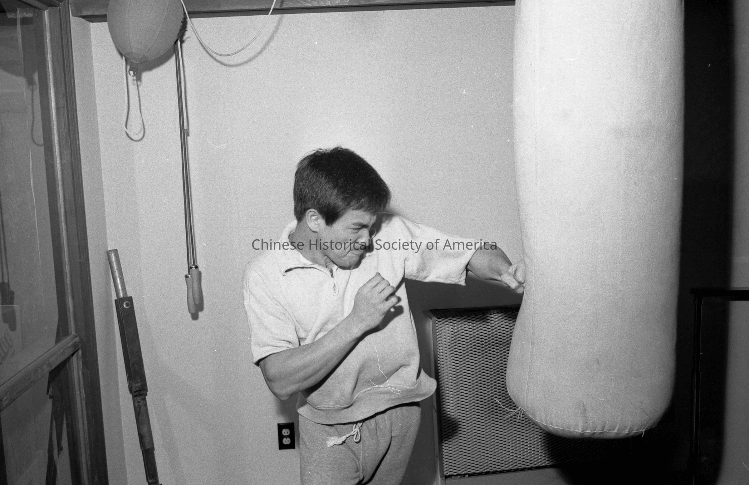 Retrieved from Bruce Lee Foundation: Bruce working out, training, punching a large punching bag, wearing sweatsuit and boxing gloves, practice, sweatshirt, home, gym.