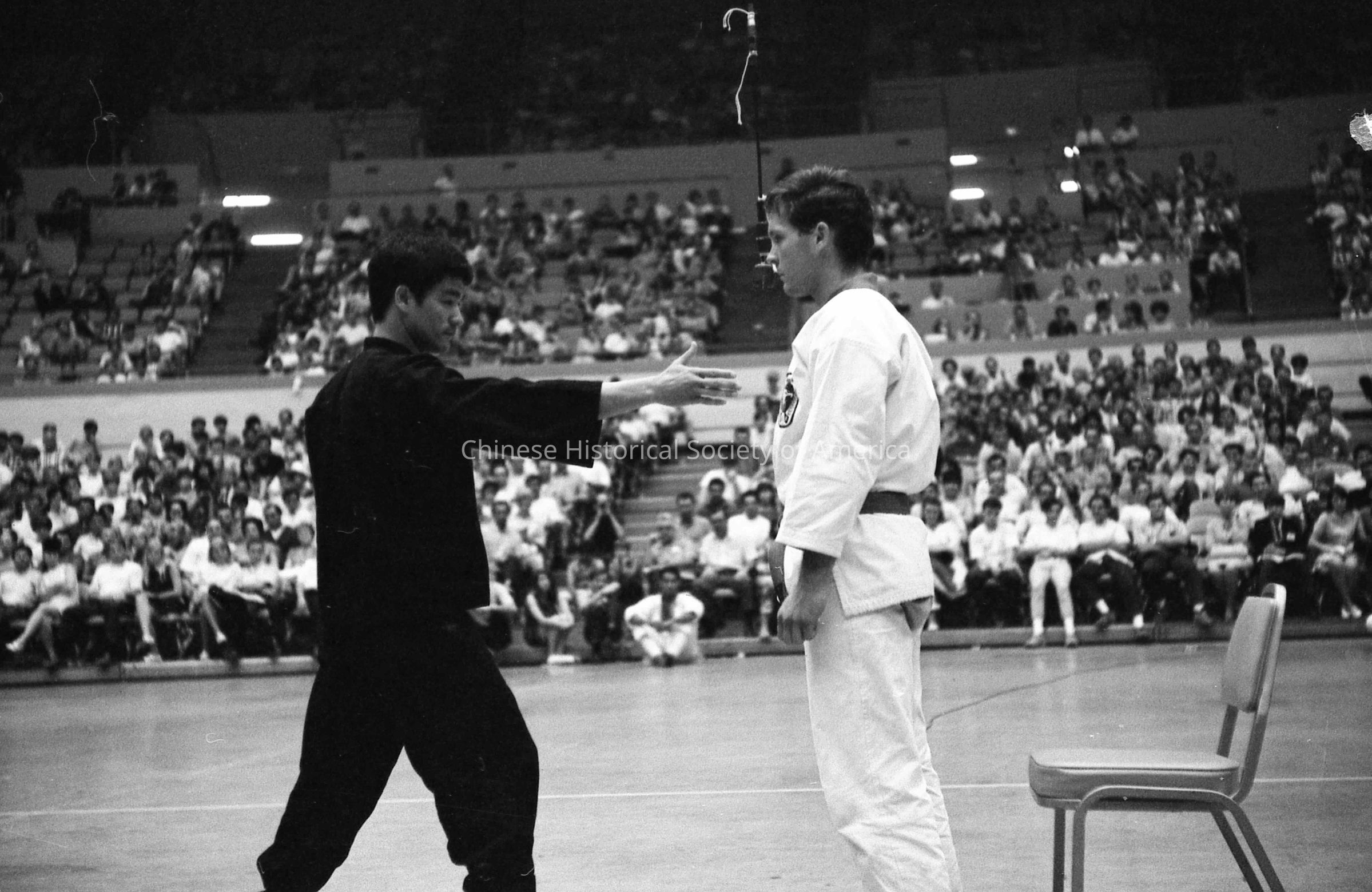 Retrieved from Bruce Lee Foundation: Bruce in black gi with hand extended to opponent, in preparation for one inch punch, at tournament (Long Beach ?), fighting opponent, with stadium seating crowd.