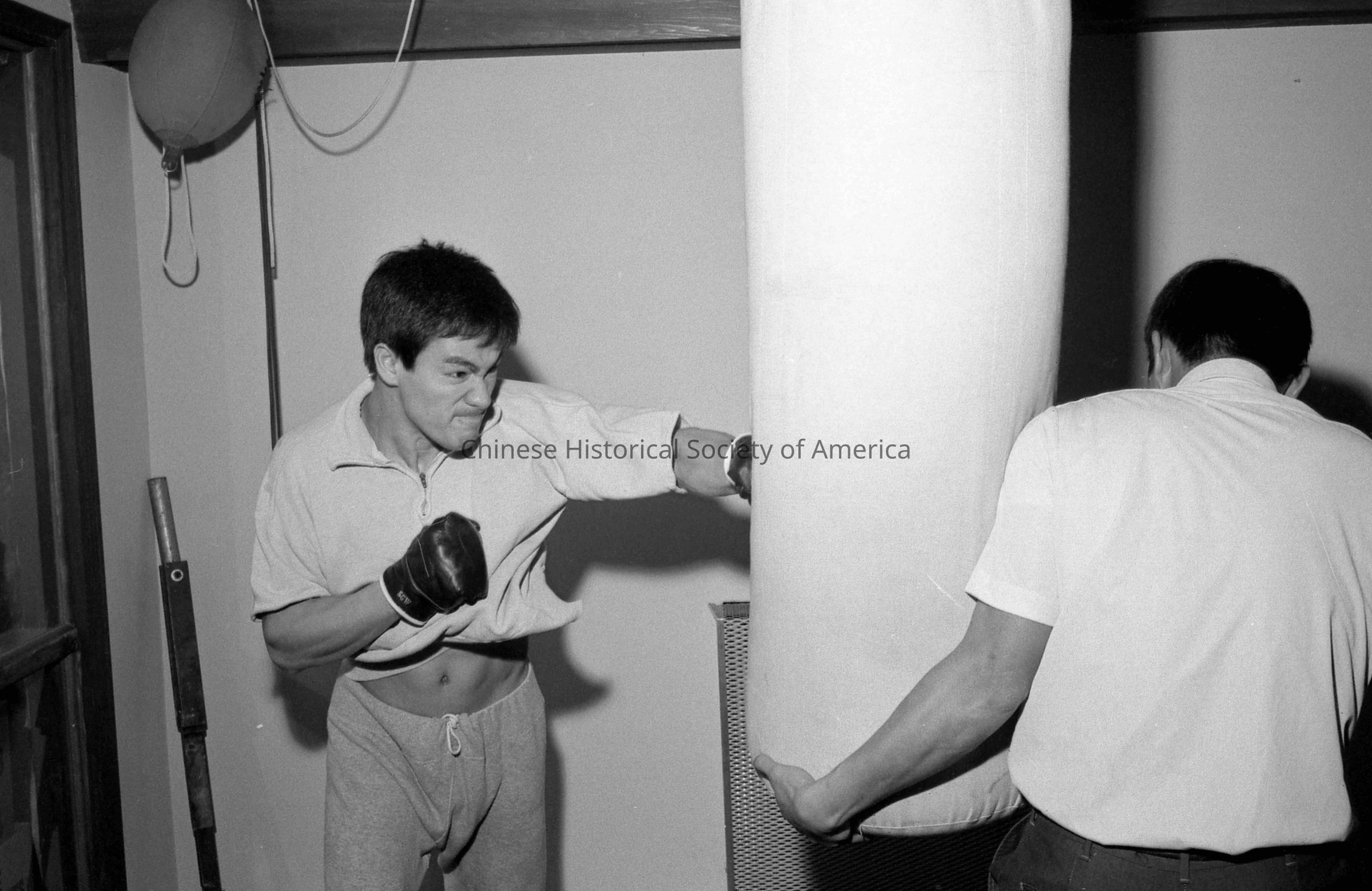 Retrieved from Bruce Lee Foundation: Bruce working out, training, punching a large punching bag, wearing sweatsuit and boxing gloves, practice, sweatshirt, home, gym.