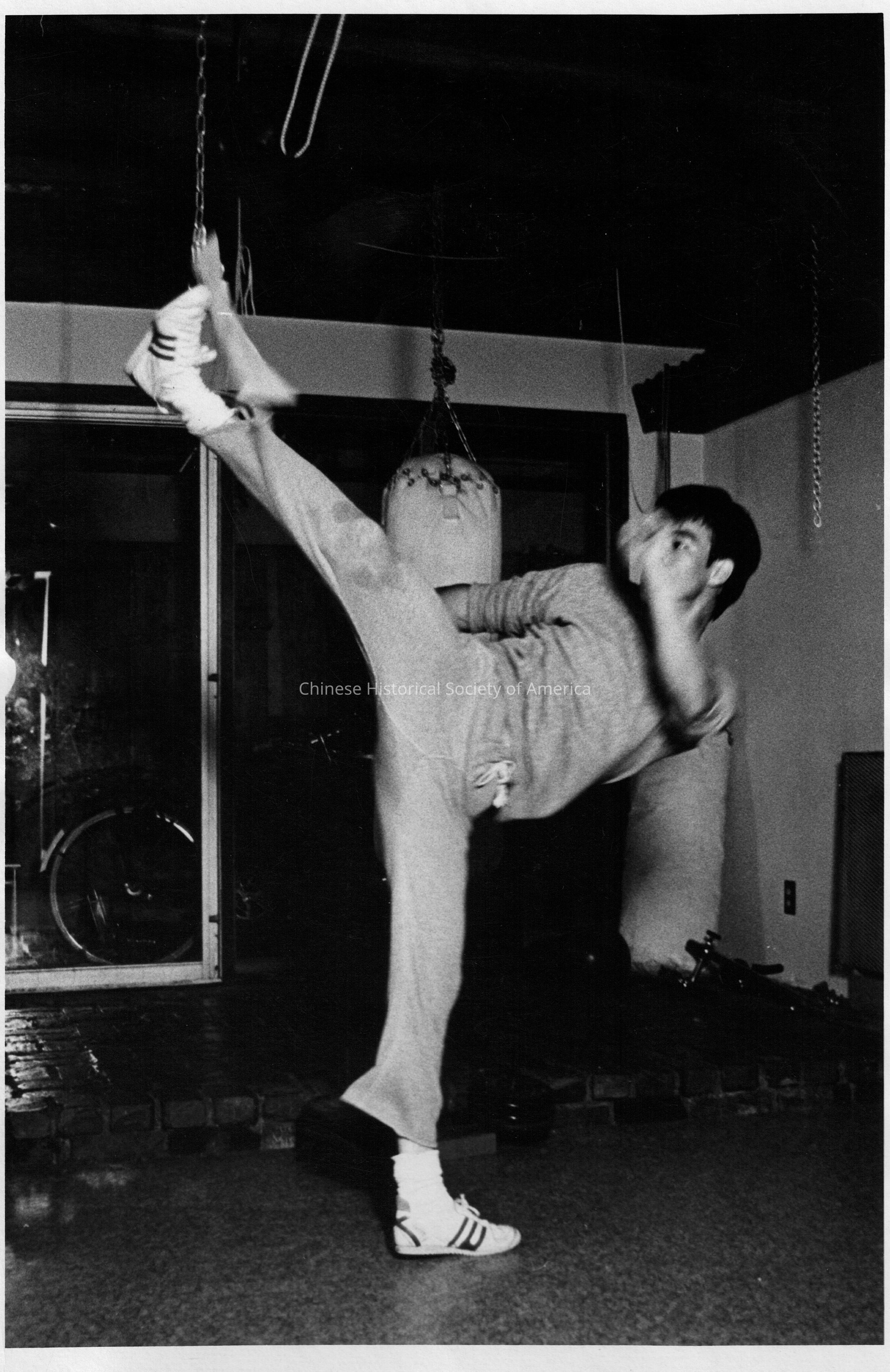 Retrieved from Bruce Lee Foundation: Bruce in sweatsuit, working out, high kick, kicking chain, in gym. Face partially obscured by hand.