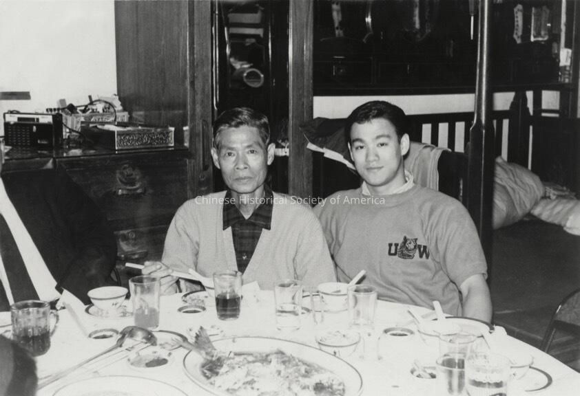 Retrieved from Bruce Lee Foundation: Bruce in UW University of Washington Huskies sweatshirt, college, arm around father, portrait. Hong Kong (?)