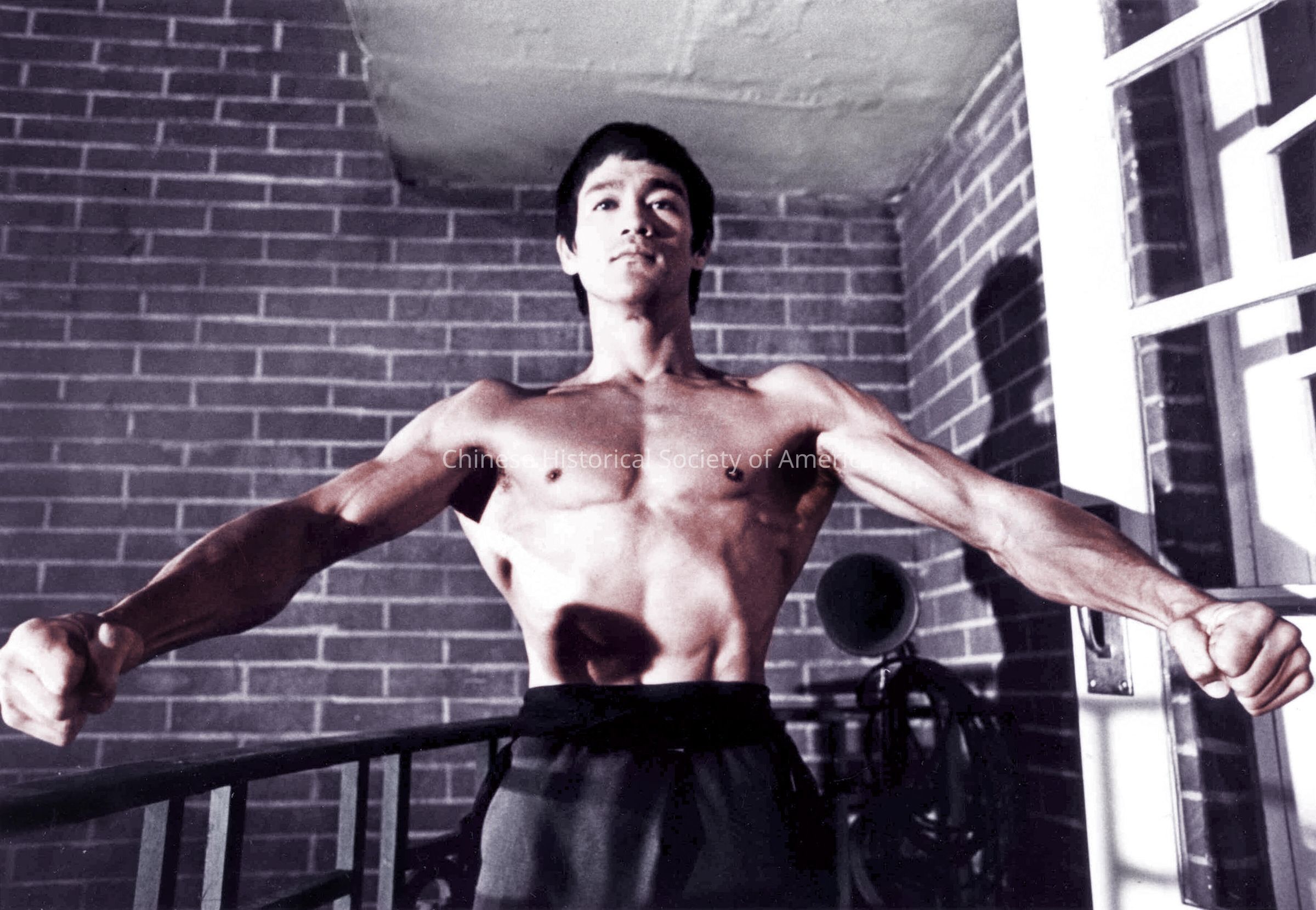 Retrieved from Bruce Lee Foundation: Bruce posing shirtless, arms extended action shot of WOD, training, on patio of apartment, brick wall in background. Photographed from below, center, iconic portrait.