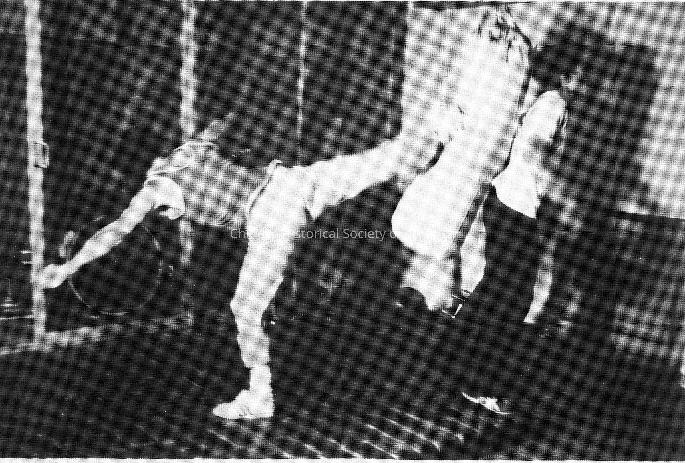Retrieved from Bruce Lee Foundation: Bruce in tank top kicking punching bag, with unknown man behind bag, on brick patio at home. Photographed from behind, face obscured.