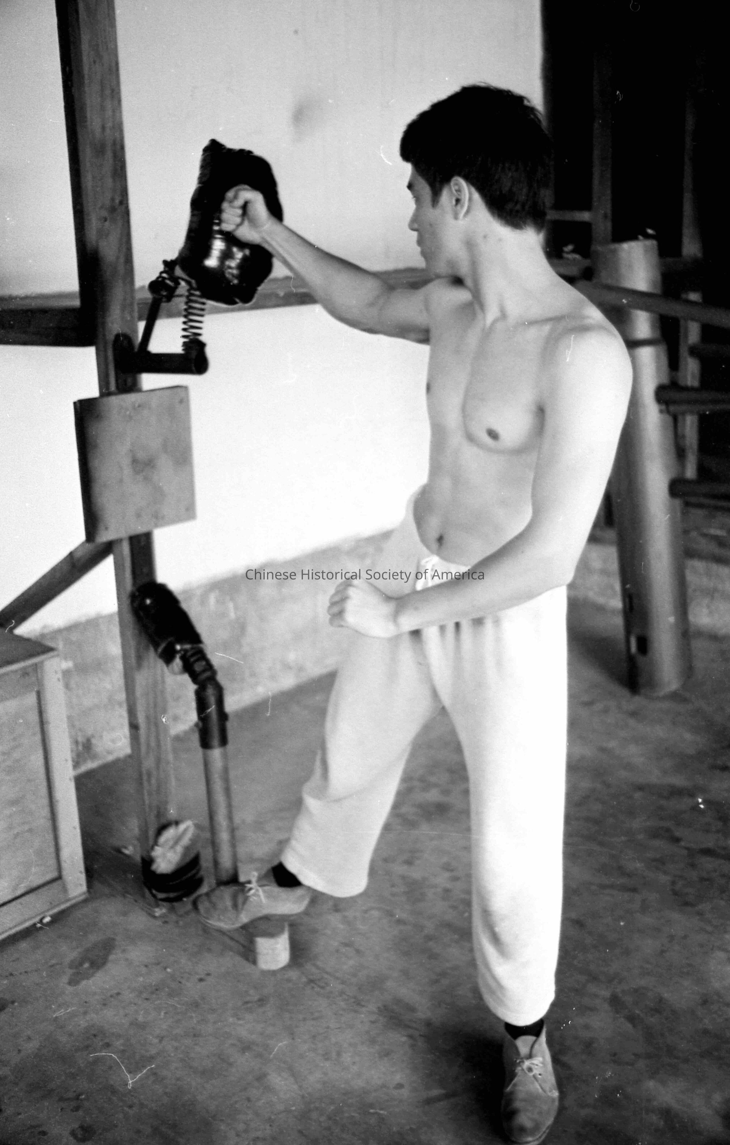 Retrieved from Bruce Lee Foundation: Bruce shirtless, wearing sweats, desert boots, in work out, punching face bag, punching bag, gym.