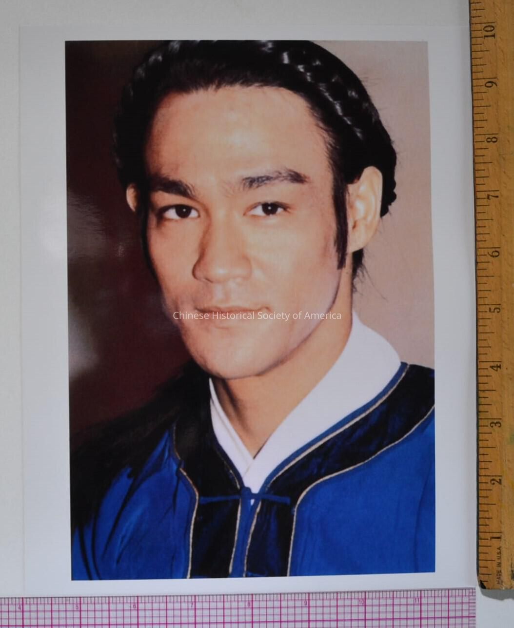 Close-up of Bruce Lee wearing Chinese costume with the front hair braidedContext