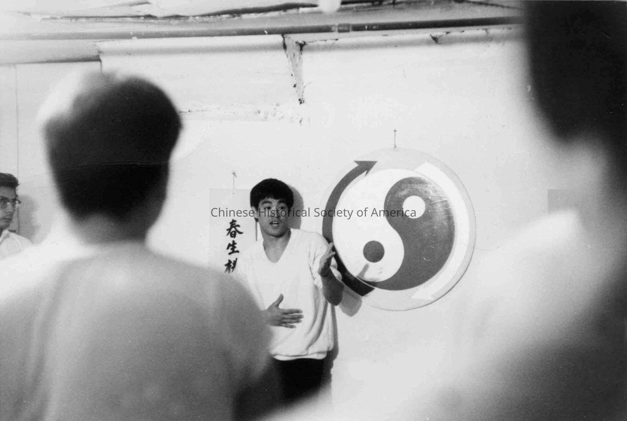 Retrieved from Bruce Lee Foundation: Bruce in white sweater talking to students at martial arts school, hand raised, core symbol and Chinese writing on wall, students backs in foreground.