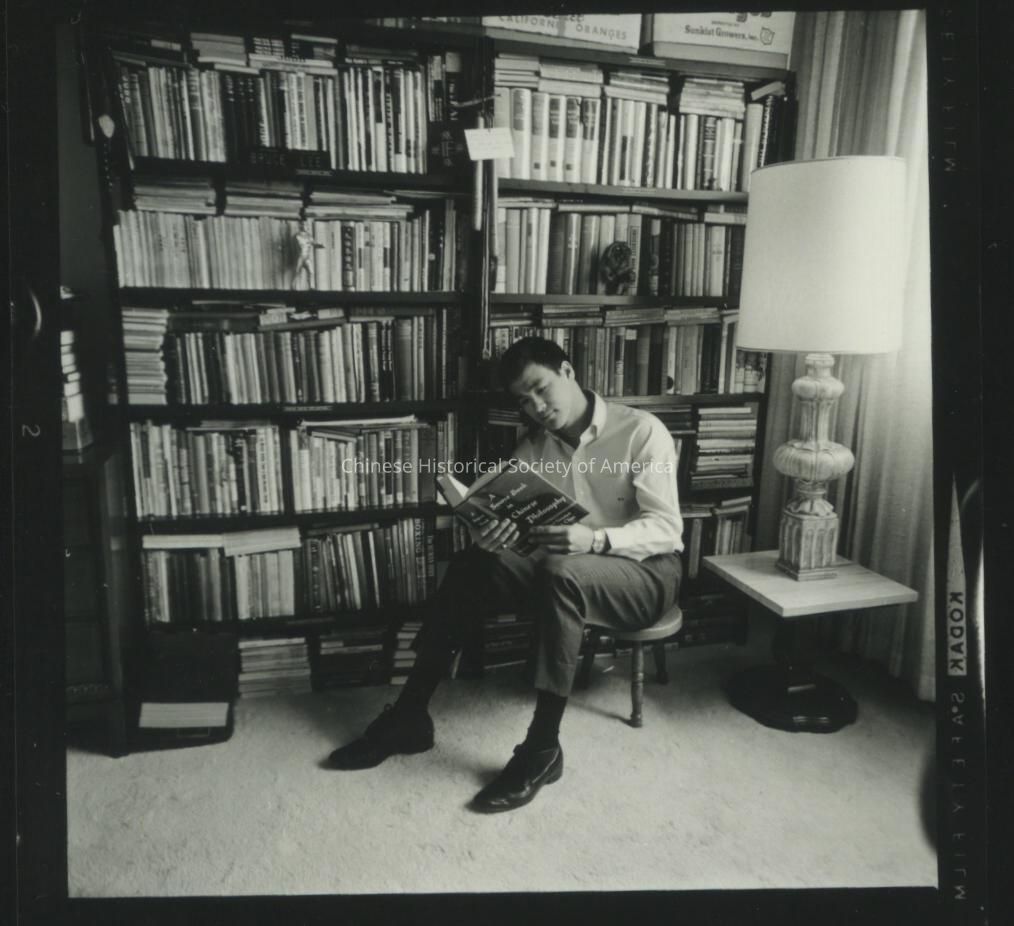 Bruce Lee reading a book of Chinese philosophy while sitting on chair, n.d. (reproduction)Context