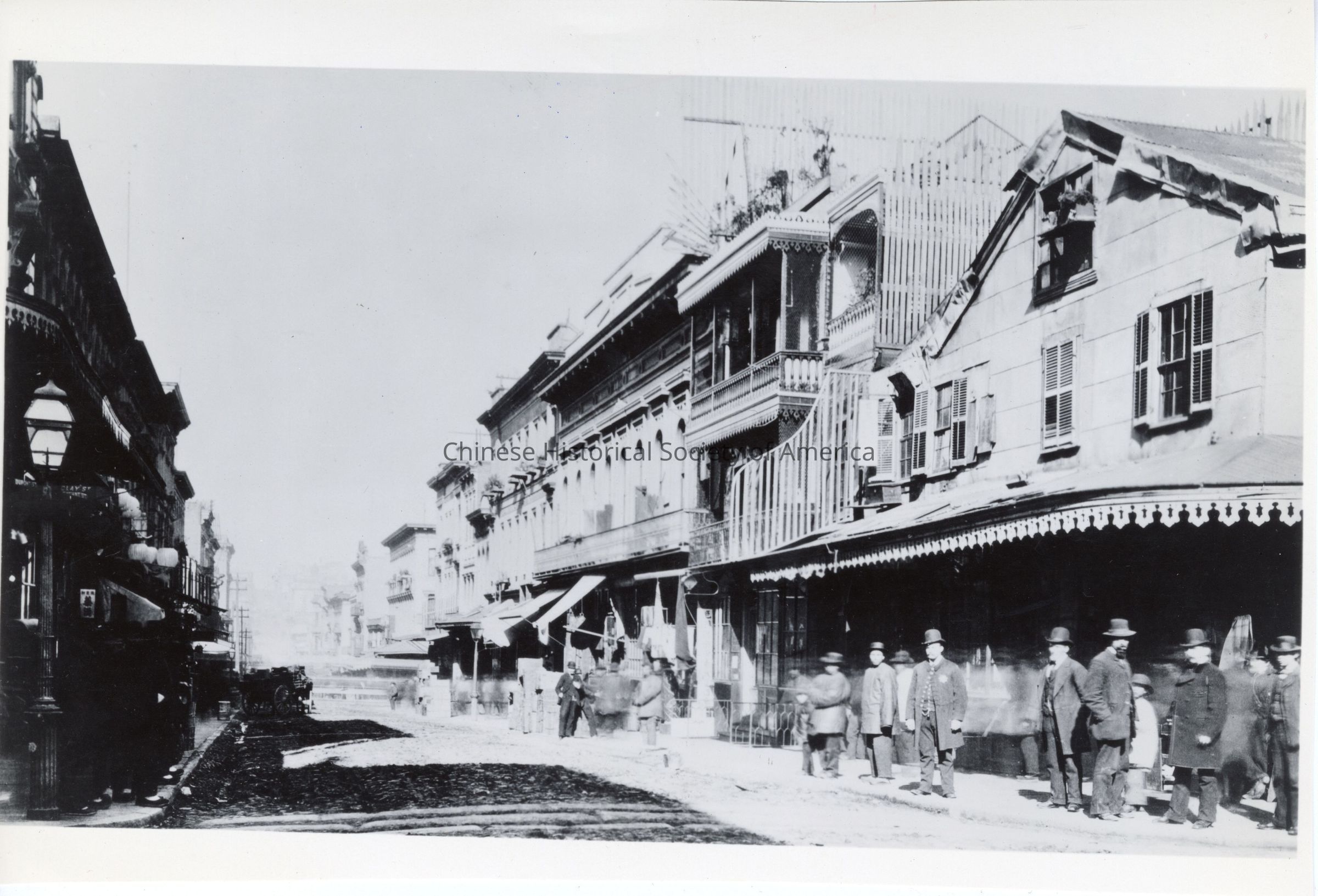 B/W photograph of San Francisco Chinatown street scene, a group of people on the street; '1862' noted on the verso; placed in sleeveDimensions
