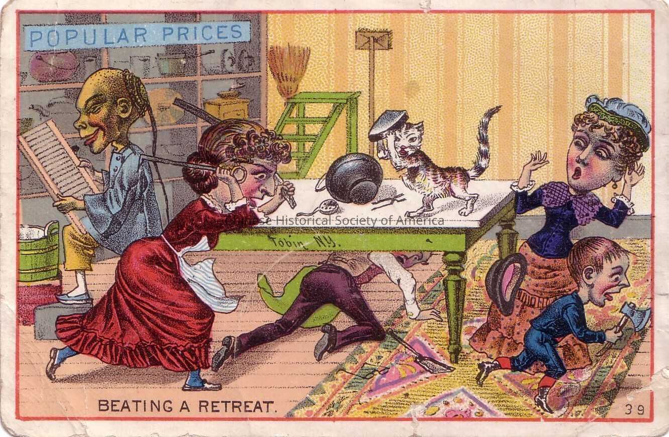 The word "Popular Prices" written in blue and highlighted in blue can be found on the upper left hand corner while the words "Beating a Retreat is at the bottom. Tobin, NY is inscribed on the side panel of the green table.