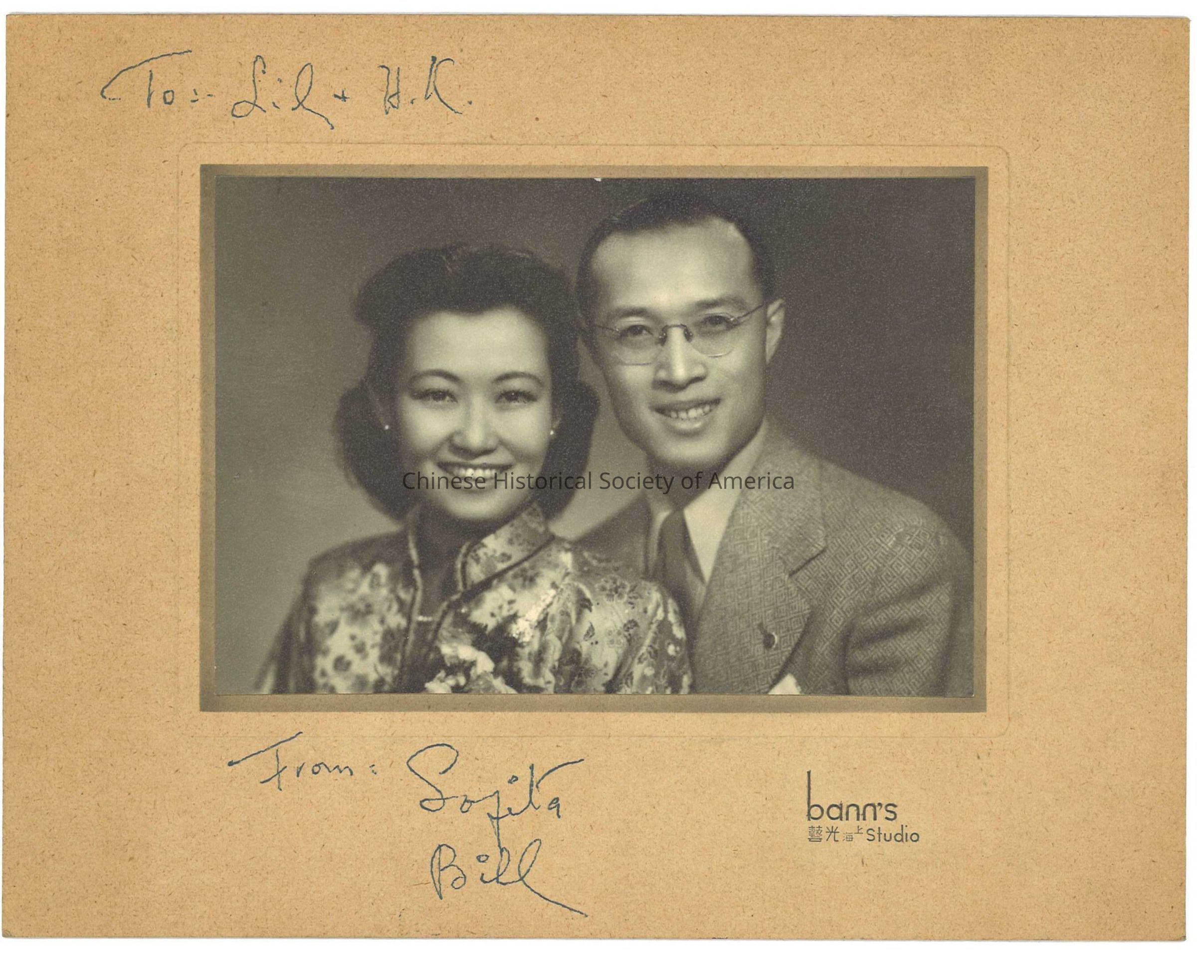 Black and white portrait of Sofila and Bill in front of a grey backdrop. Sofila is wearing am embroidered dress and Bill is wearing a flannel suit and glasses. Both smile at the camera.