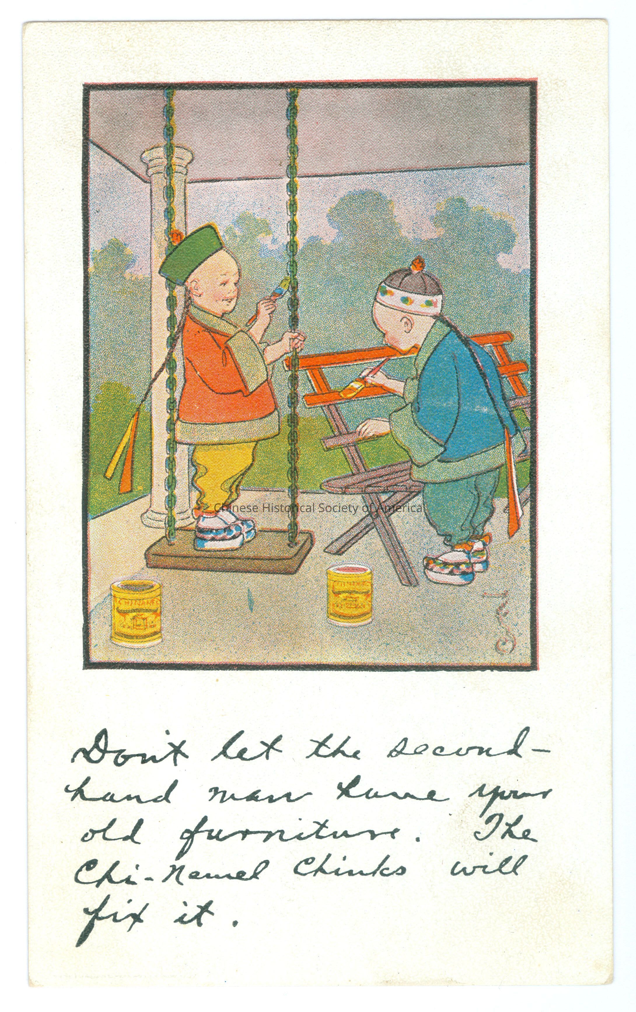 See CHSA-04816-04819. Front: Caption: "Don't let the second-hand man have your old furniture. The Chi-Namel Chinks will fix it." Back: Old Accession #: DMRX
