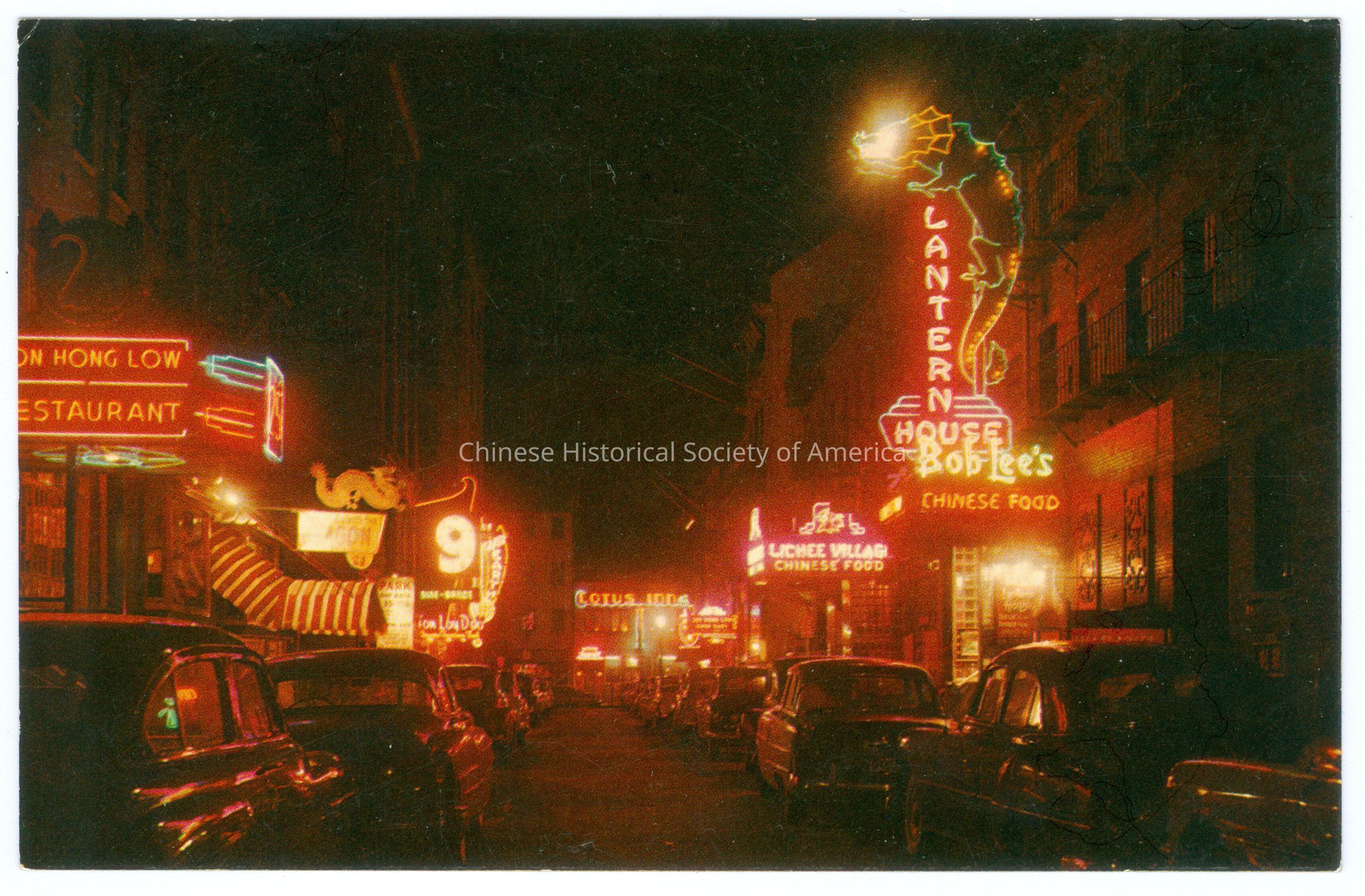 Back: Info. Text: "Chinatown At Night-Boston, Mass. Here is shown Boston's colorful Chinese Colony. Boston's Chinatown is always a source of interest to visitors and is famous for its restaurant which offer Cantonese and Mandarin delicacies in a delight atmosphere."; "'Lusterchrome" REG. U.S. Pat. Off. Made only by Tichnor Bros., Inc., Boston 15, Mass." Old Accession #: D)-