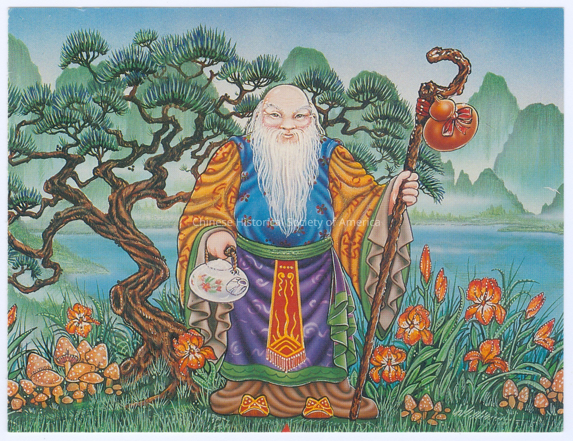 Color. Illus. Ads; Chinese Gods; Celestial Seasonings: A Chinese man with a long white beard is holding a wooden staff and a teapot standing in front of a tree and water with green plants and orange blossoms at his feet.